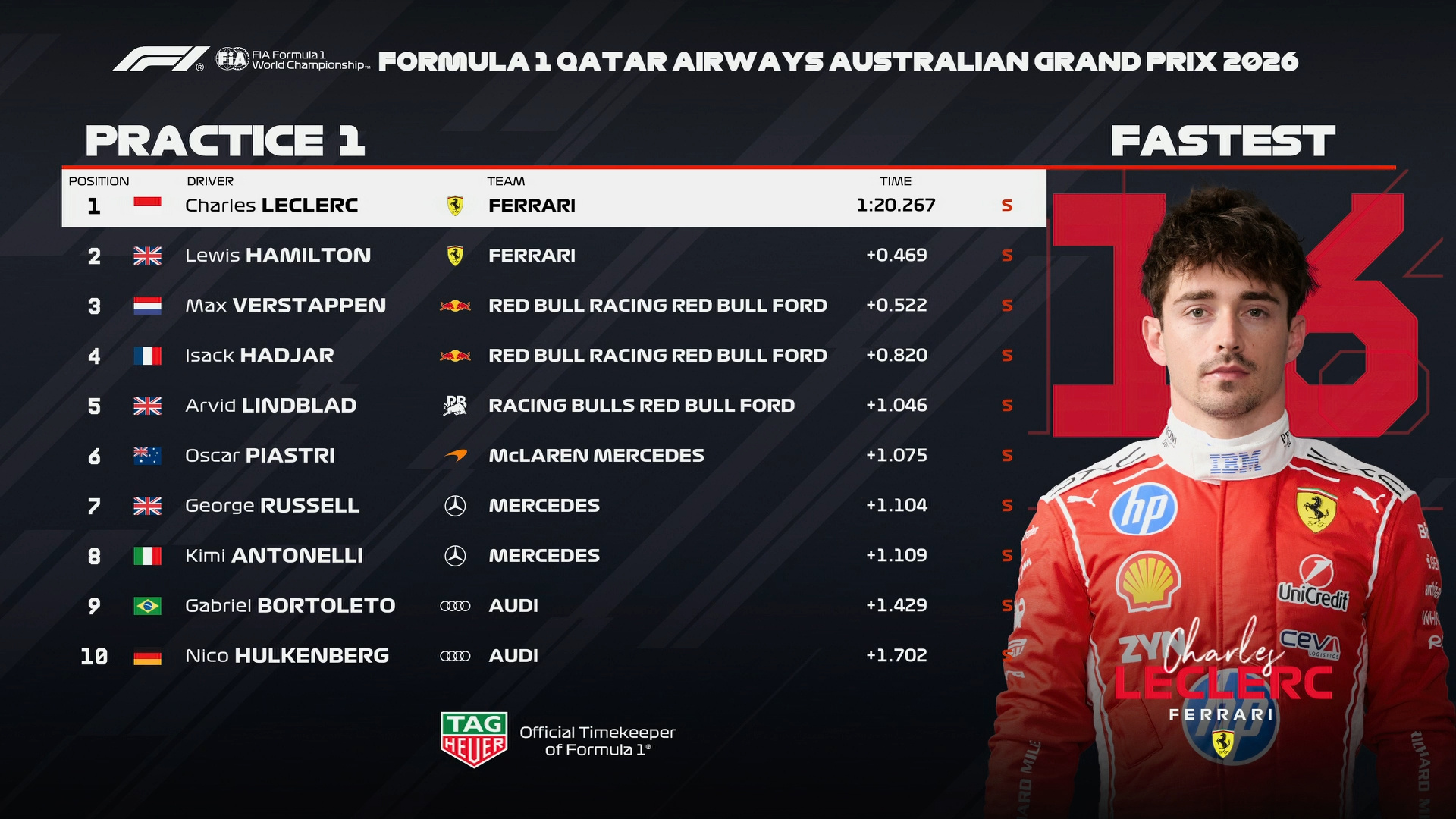 澳大利亚大奖赛一练成绩表如图,北京时间13点二练!F12026F1澳大利亚大奖赛