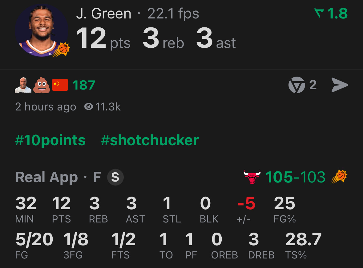 杰伦·格林过去6场比赛有4场运动战不到27%vs公牛 20投15分vs湖人 15投9分vs绿军 18投13分vs魔术 26投16分公牛vs太阳NBA