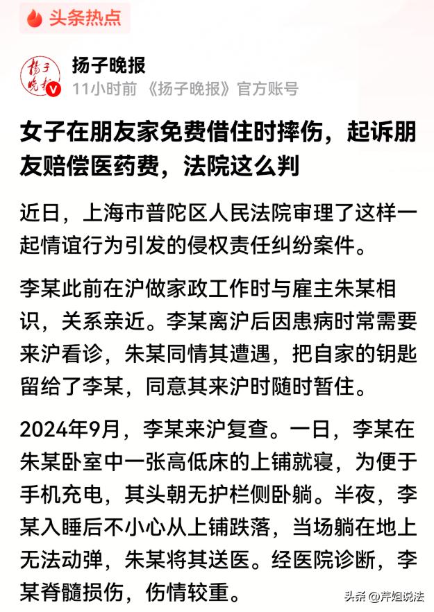 上海,朱某和保姆李某,原本处得比亲姐妹还亲。李某辞职回老家养病,来回上海复查时,朱某干脆把自家钥匙给了她,让她随时来住。这事搁谁身上都觉得暖心吧?可谁能想到,一场意外让这份情谊变了味。 2024年9月,李某又来上海复查。前几晚她都睡沙发,复查那天突然想换个环境,自己爬上了高低床的上铺。 结果半夜翻身时,头朝无护栏的那侧,直接摔了下来,疼得半天动不了。 朱某赶紧把她送去救治,一查是脊髓损伤。 李某一听要治疗,第一反应不是感谢朱某送医,而是觉得朱某得赔钱。她认为,自己是在朱某家摔伤的,朱某就得负责。 朱某当场就懵了:我好心让你住,一分钱没要,你摔了还要我赔? 两人谈不拢,李某直接把朱某给起诉了,她觉得自己睡上铺是朱某默许的,而且床没护栏,朱某没尽到安全保障义务。 朱某则委屈得不行:我这是好心施惠,又没收她钱,她自己不注意安全,凭什么让我赔? 这事在网上一曝光,网友直接有人骂李某“农夫与蛇现实版”,有人心疼朱某“好心没好报”。 但法律上到底怎么判? 好心让他住,还必须要担责吗? 李某认为,朱某作为房屋主人,有义务保证她的安全,床没护栏,朱某就该提前想到风险,出了事,应该赔偿医疗费和损失。 朱某则坚持,自己只是好心让李某借住,没收一分钱,李某自己选择睡上铺,还选了没护栏的一侧,这能怪谁? 自己出于善意提供帮助,没有收取任何费用,李某受伤是她自己未尽到注意义务。 法院审理时,重点依据了《民法典》第1217条的规定,好意同乘、好意施惠的情况下,如果施惠人没有故意或重大过失,受益人一般不承担责任。 朱某让李某借住,完全是出于情谊,没收钱也没强迫李某睡上铺。 法院认为,李某作为成年人,完全有能力判断睡上铺无护栏的风险。她自己选择睡那里,还翻身不当导致摔伤,这属于自己未尽到注意义务。朱某没有故意或重大过失,不该担责。 最终,法院驳回了李某的诉求。 案子是判了,可两人心里都不好受。 朱某觉得寒心,以后再也不敢随便帮人了。 李某不仅受了伤,还输了官司,网友都说她“得理不饶人”。 好心帮忙受伤,到底谁该负责呢? 如果帮忙的人确实没做好安全措施,如床本身就有安全隐患,那施惠人要不要担责? 根据《民法典》第1165条,行为人因过错侵害他人民事权益,应当承担侵权责任。 但朱某的床是正常家具,无护栏也不是法律强制要求的。 李某作为成年人,应该自己判断风险。 帮忙是情分,不是本分。 受助者,也得有基本的感恩和自保意识。 你觉得李某该不该索赔?朱某的好心帮忙,值得吗?