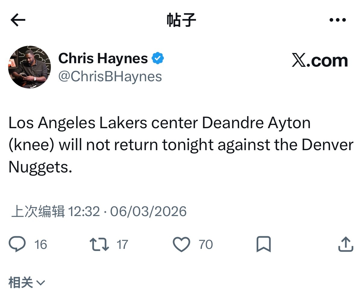 湖人官方更新伤病报告:艾顿因膝伤本场比赛不会回归。湖人vs掘金