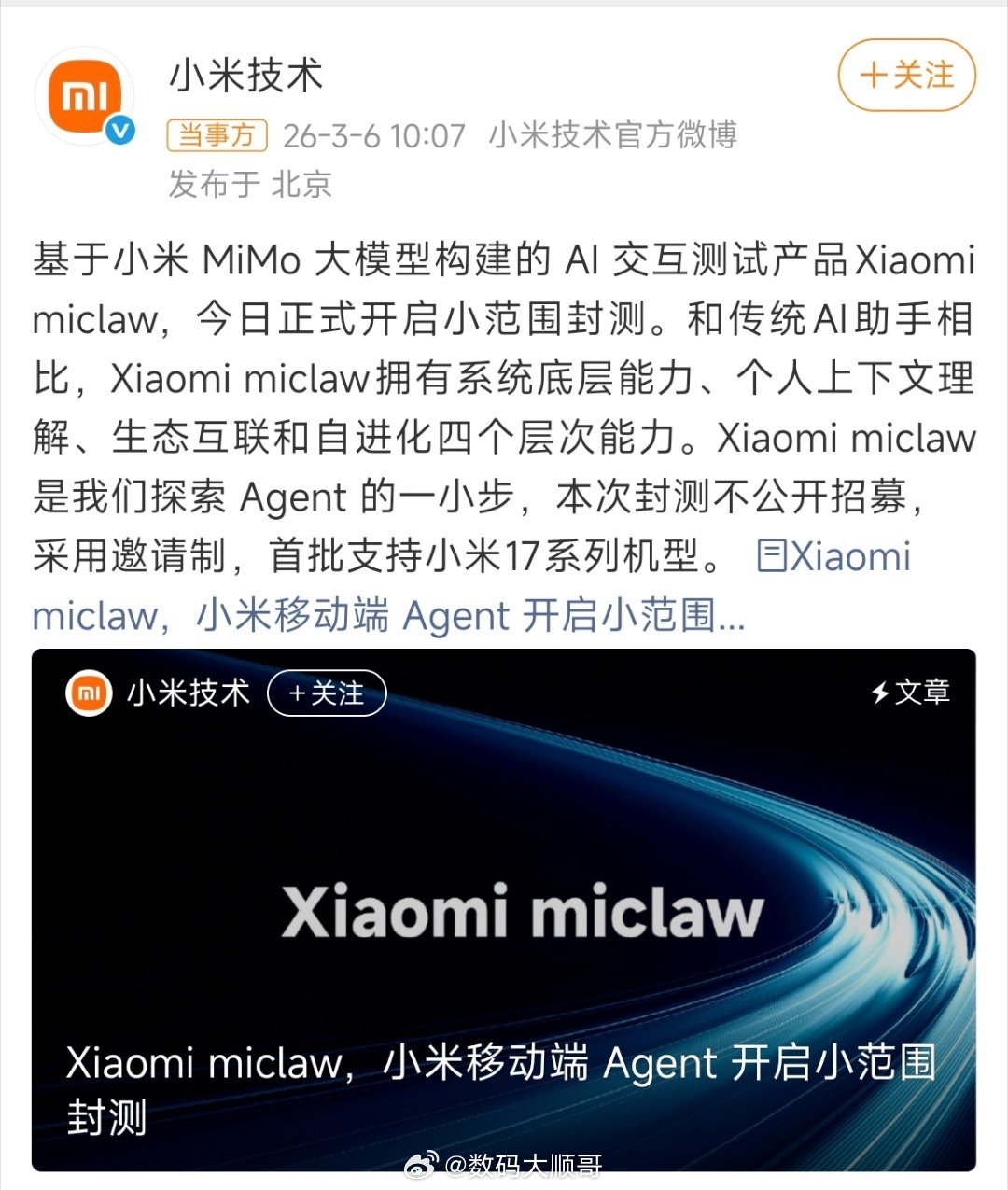 小米miclaw开启封测小米Miclaw开启封测,国内首个手机版龙虾Agent正式亮相!依托MiMo大模型,拥有底层、上下文、生态、自进化四大能力,邀请制仅限小米17系列。从动口到动手,小米AI又迈出关键一步,人车家全生态再升级。