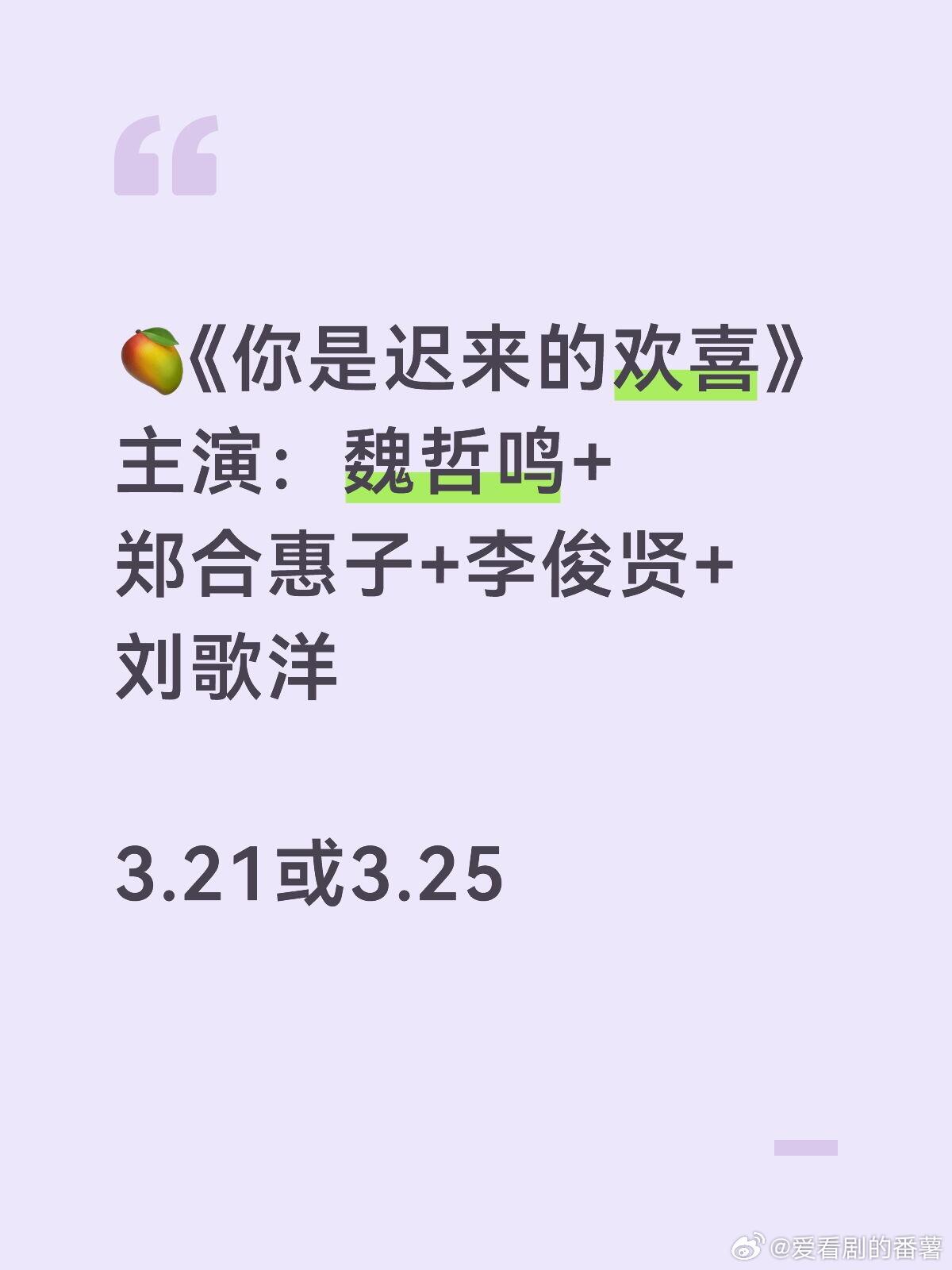 🥭《你是迟来的欢喜》主演:魏哲鸣+郑合惠子+李俊贤+刘歌洋3.21或3.25