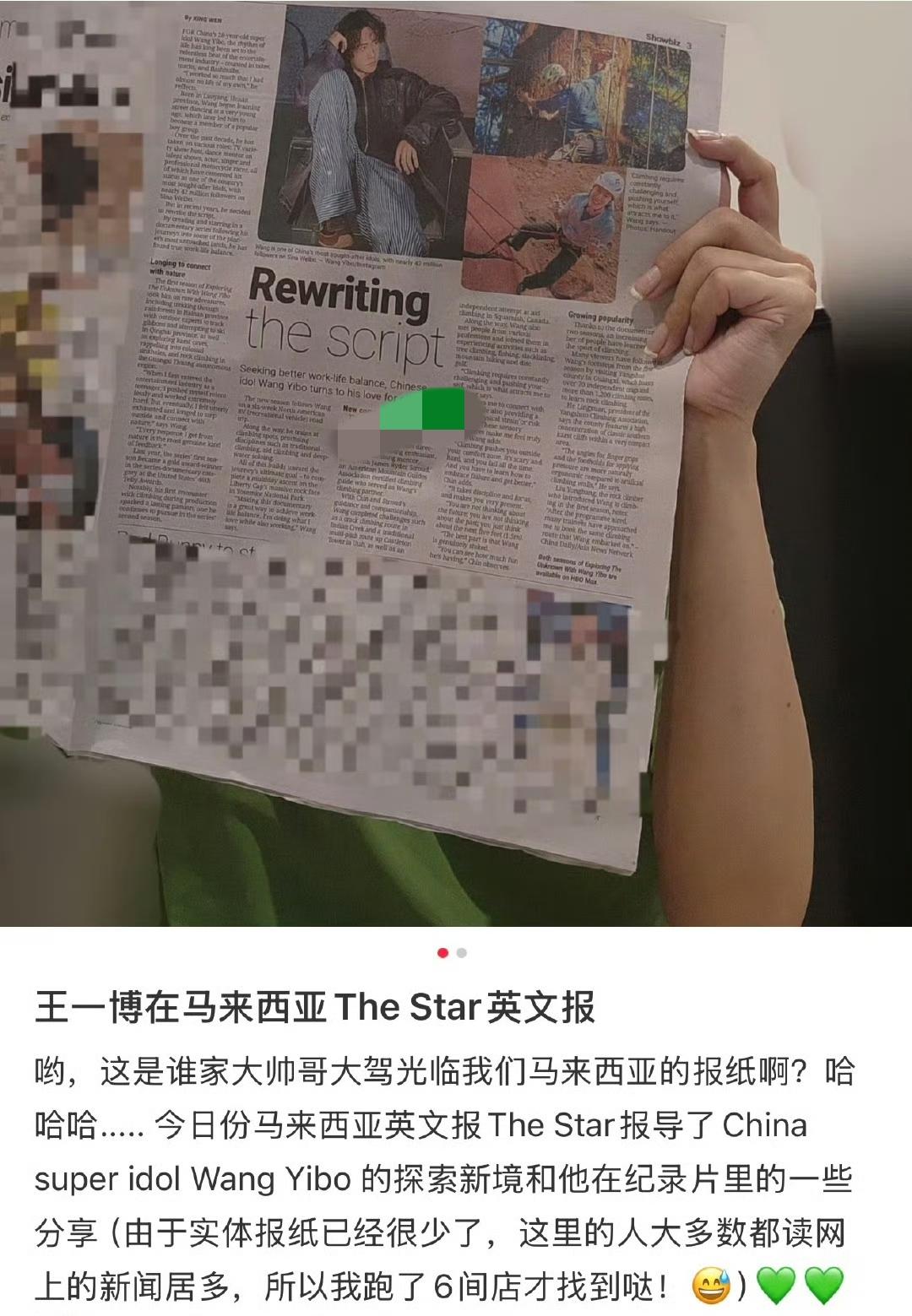 王一登上马来西亚报刊《星报》,妥妥的国际巨星王一博[赞]。 文章以整版篇幅和《为寻求更好的工作与生活平衡,中国明星王一博爱上攀岩》为题,介绍了王一博(China surper idol Wang Yibo)作为发起人的个人ip户外探险纪实纪录片《探索新境》。 ps:《星报》是马来西亚发行量最大的付费英文日报。