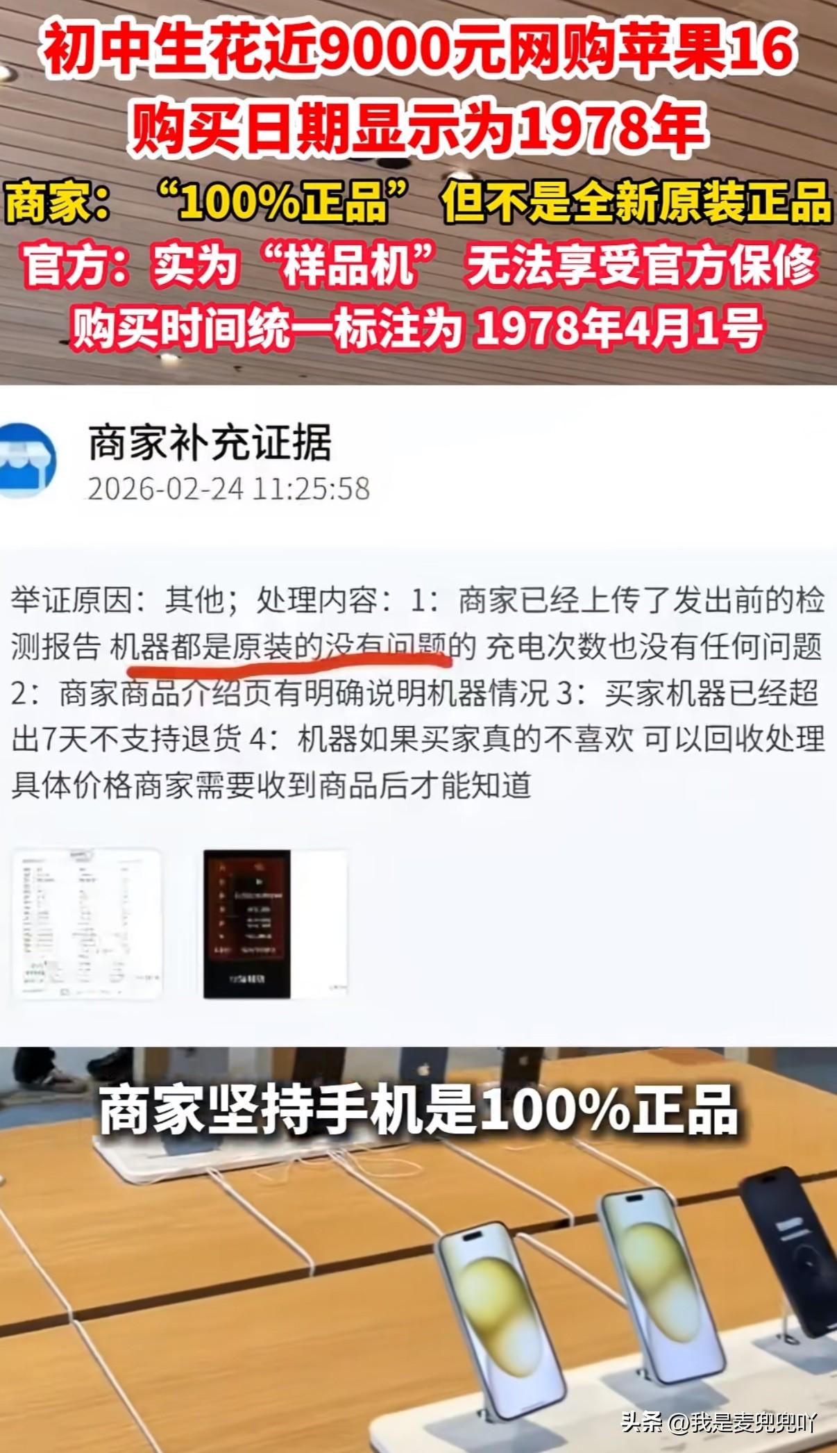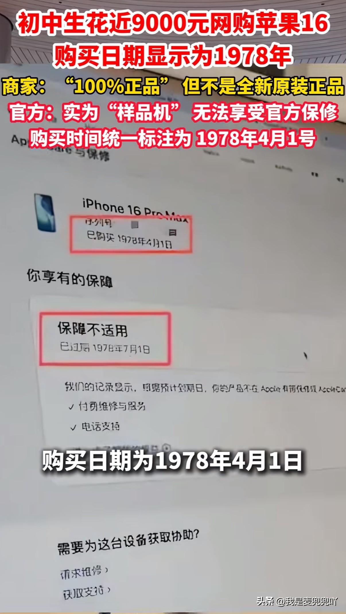 初中生花近9000元买苹果手机却买到1978年的样品机,无法享受官方保障,商家坚称100%正品但又承认不是全新原装机并且不支持退货 初中生小金在过年期间用零花钱在第三方平台花了近9000元购买苹果16pro Max512g,使用过程中手机出现间歇性无法充电的情况前往苹果线下门店检测,苹果工作人员告诉他手机的购买激活时间为1978年4月1号 小金拿着苹果线下门店开具的检测报告找到商家时,商家坚称手机为100%正品但又承认不是全新原装正品如果要退货只能按回收价处理 苹果官方表示小金购买的手机为样品机,无法享受官方保修服务,苹果为了区别全新手机和样品手机避免不法商家违规销售,已经特意将所有样品机的激活时间统一标注为1978年4月1号 拿着样品资源机当国行全新卖无良商家是真缺德