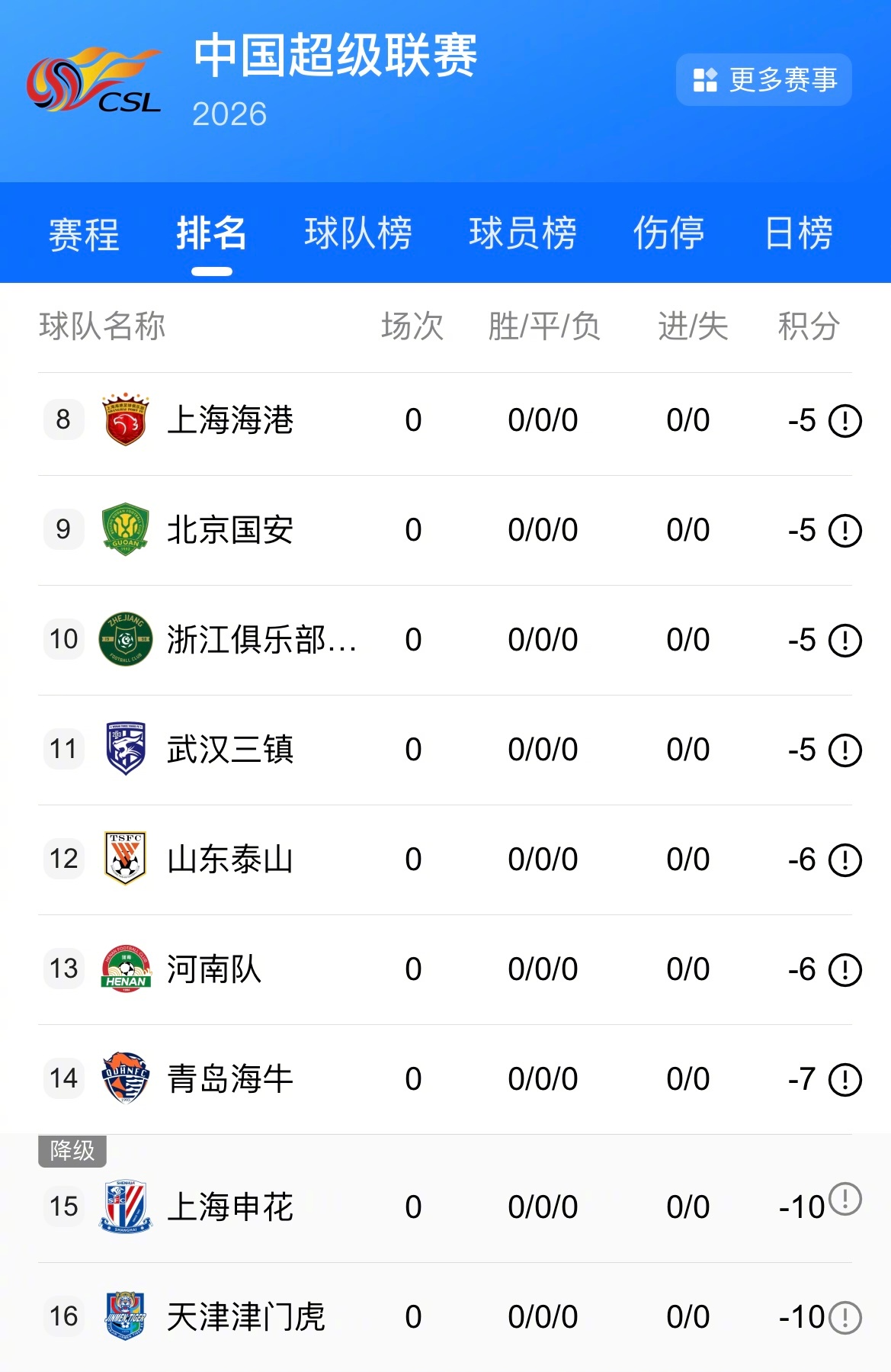 2026赛季中超联赛将于2026年3月6日开幕,至2026年11月8日结束。在赛季正式开始前,官方已公布了初始积分榜,其中多支球队因违反财务等规定被扣除积分,导致以负分开局。具体的16支球队及其初始积分如下图(按初始积分排序):中超联赛