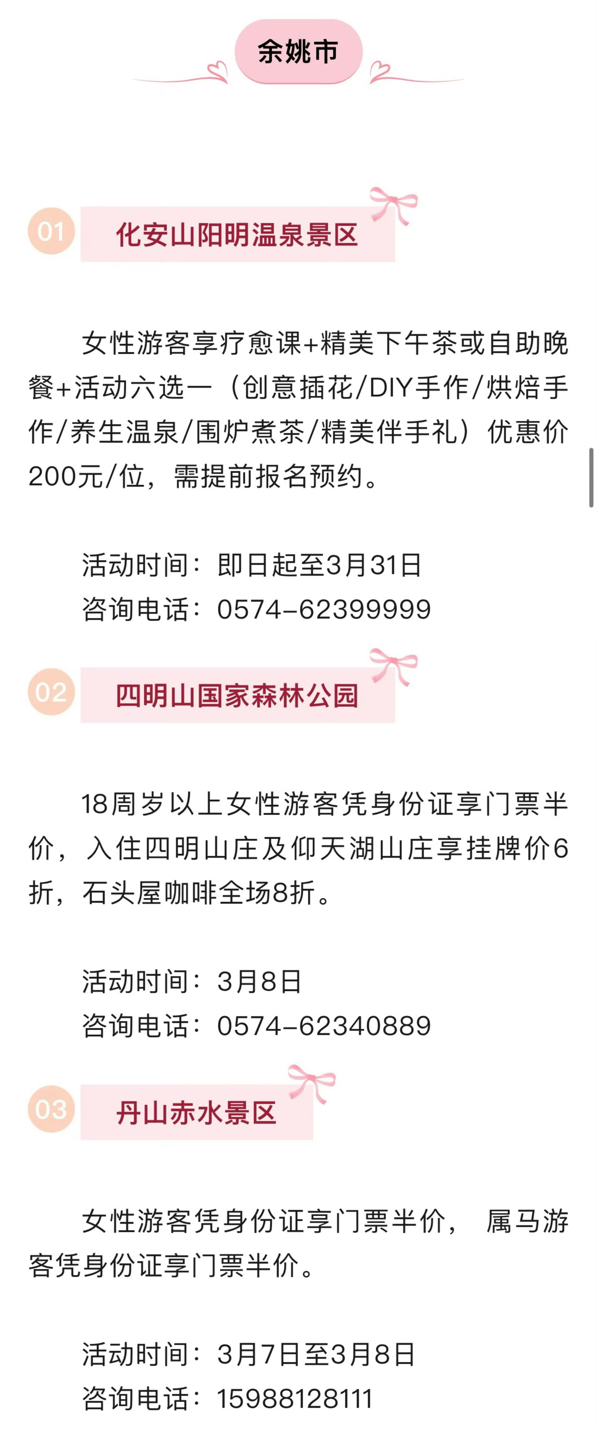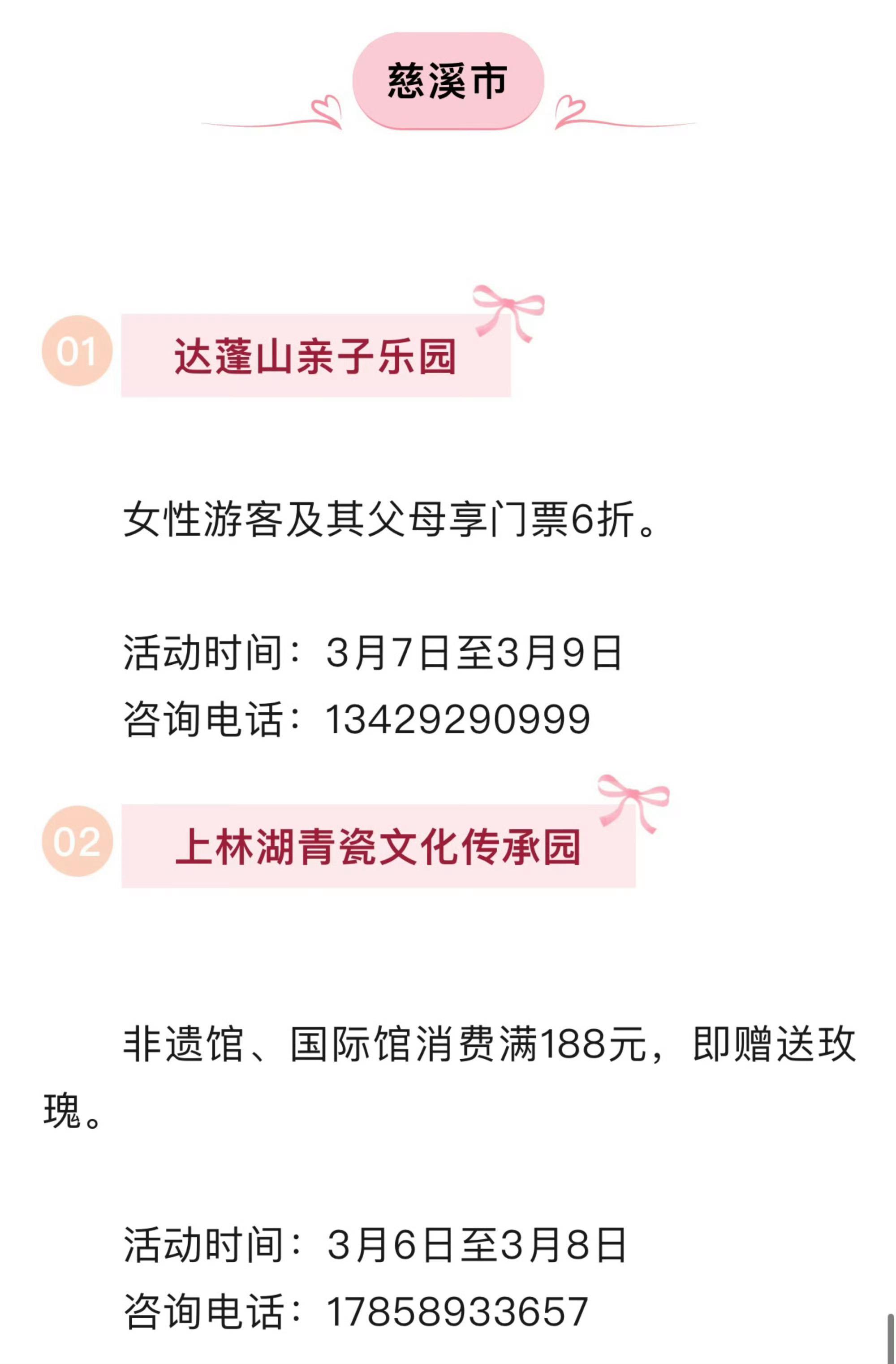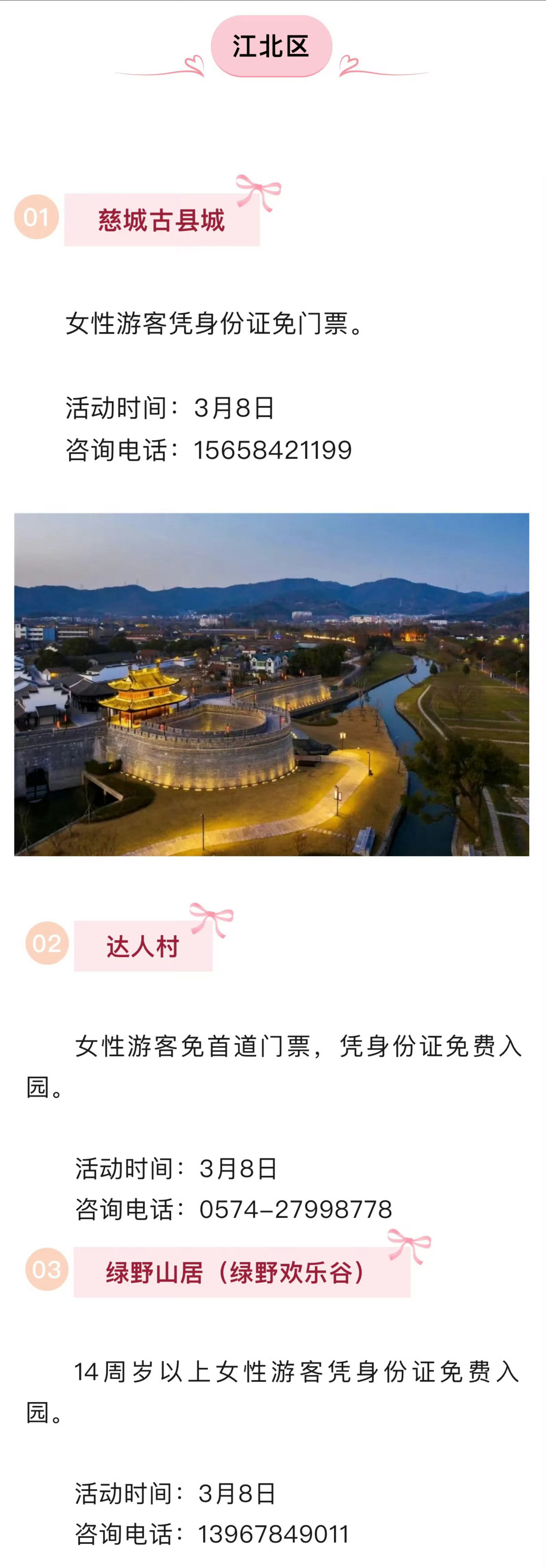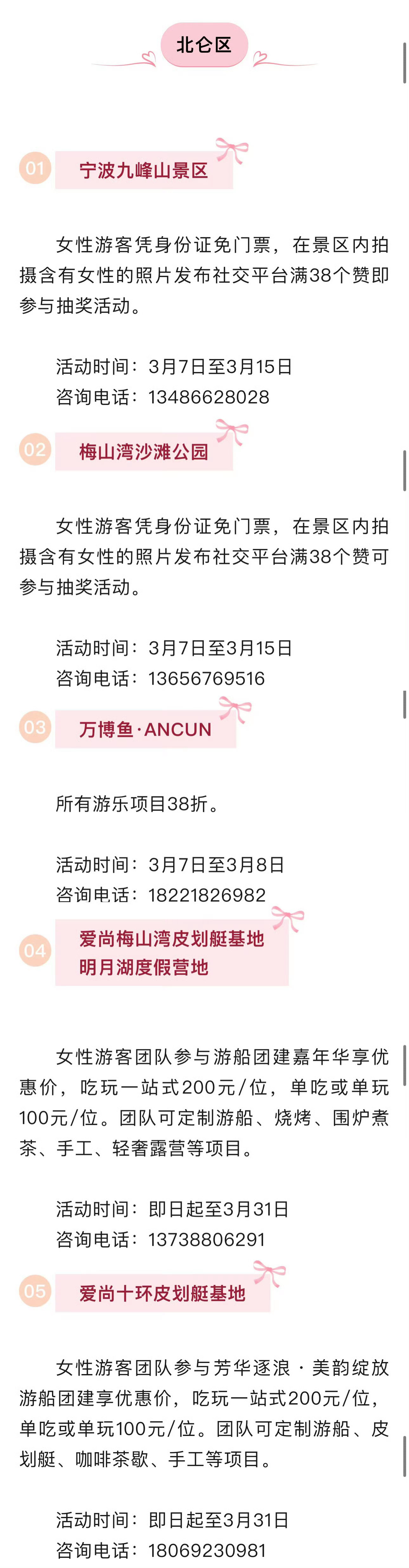 三八节宁波免费景点出游指南 姐妹们集合‼️三八节宁波出游指南🆓免费那种三八妇女节要来啦宁波一大波景区对女生放大招免费!半价!专属优惠!我为大家整理好啦快拉上闺蜜一起去打卡👇🌟海曙天一阁博物院|3.8 女生半价🌟江北慈城古县城|3.8 女生凭身份证免门票达人村|3.8 女生免首道门票[赞R]绿野欢乐谷|3.8 14岁以上女生免门票🌟镇海九龙湖旅游区|即日-3.10 “穿越时空套餐”38元(原价60),还有手作体验+文创礼品限量送🌟北仑九峰山、梅山湾沙滩公园| 3.7-3.15 女生免门票,拍照集赞还能抽奖万博鱼·ANCUN|3.7-3.8 所有项目3.8折爱尚梅山湾皮划艇基地明月湖度假营地|即日-3.31 团队游200元/位(吃+玩)爱尚十环皮划艇基地|即日-3.31 团队优惠200元/位🌟鄞州天宫庄园|3.8 14岁以上女生免门票罗蒙环球乐园|3.4-3.8 女生130元,男生199元🌟奉化奉化博物馆|3.8 18岁以上女生手作体验(需押金)溪口-滕头景区|3.6-3.30 女生订酒店免门票(付30元交通费)🌟余姚化安山阳明温泉|即日-3.31 女生套餐200元/位四明山国家森林公园|3.8 18岁以上女生门票半价、住宿6折丹山赤水|3.7-3.8 女生及属马🐎游客门票半价🌟慈溪达蓬山亲子乐园|3.7-3.9 女生及父母门票6折上林湖青瓷文化传承园|3.6-3.8 消费满188送玫瑰🌟宁海伍山石窟|3.7-3.8 女生门票38元梁皇山|3.7-3.8 女生半价,属马女生免门票🌟象山石浦渔港古城、中国渔村|即日-3.15 女生优惠价38元🌟前湾新区宁波方特|3.4-3.31 所有游客140元杭州湾湿地公园|3.8 女生38元宁波鲸途海洋乐园|3.7-3.8 18岁以上女生38元🌟东钱湖宁波野生动物园|女生138元,70岁以上38元;90天卡238元8⃣️号正好是周末快约上姐妹冲呀🌸寻美浙江同城热点创作计划