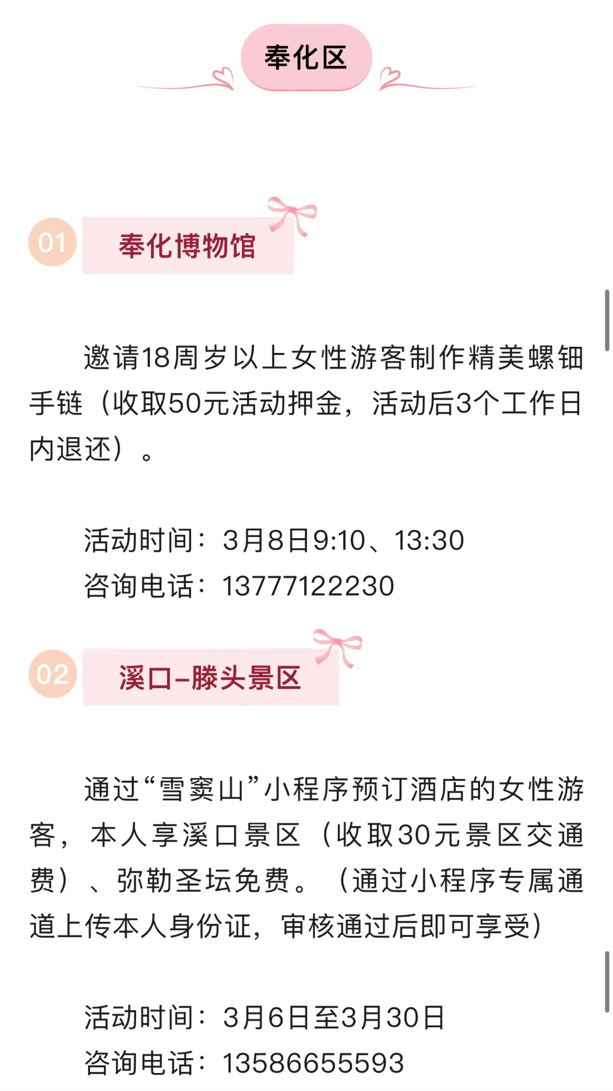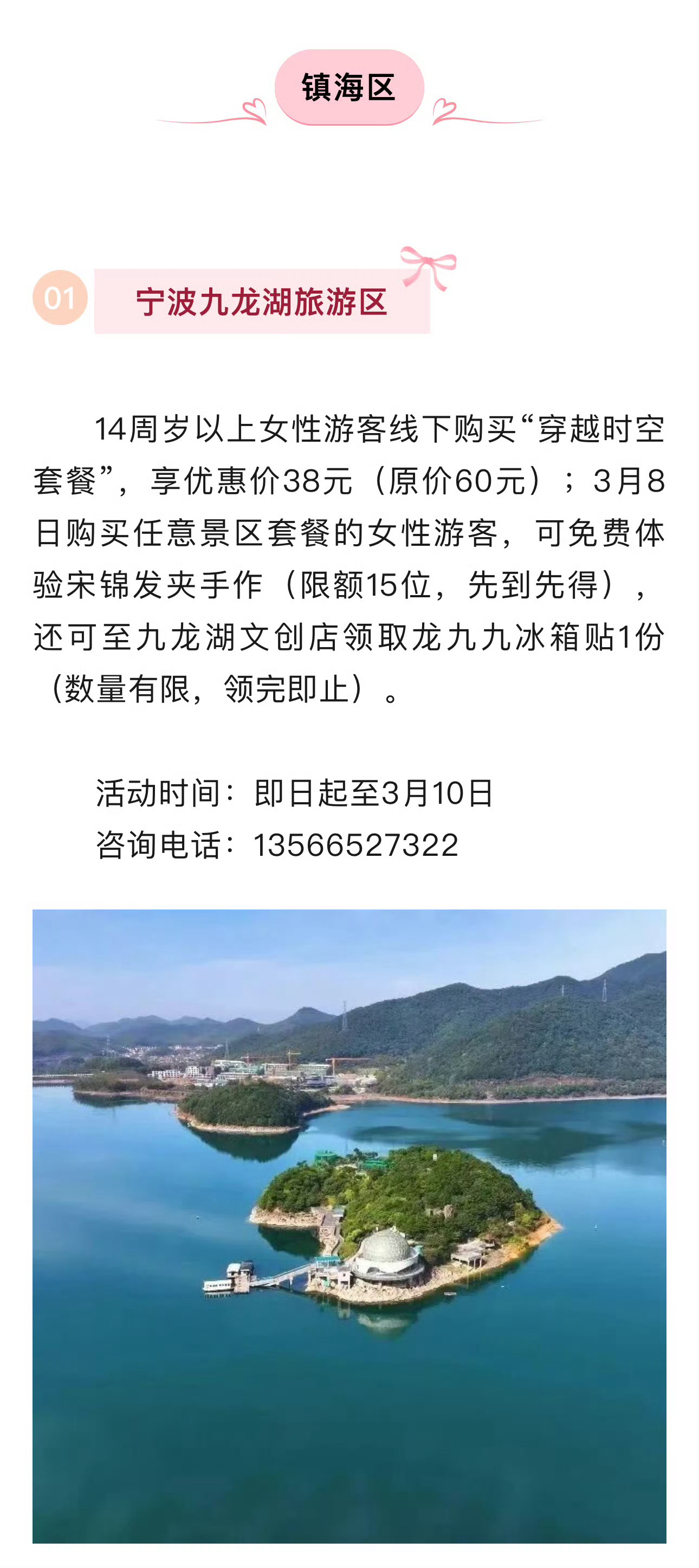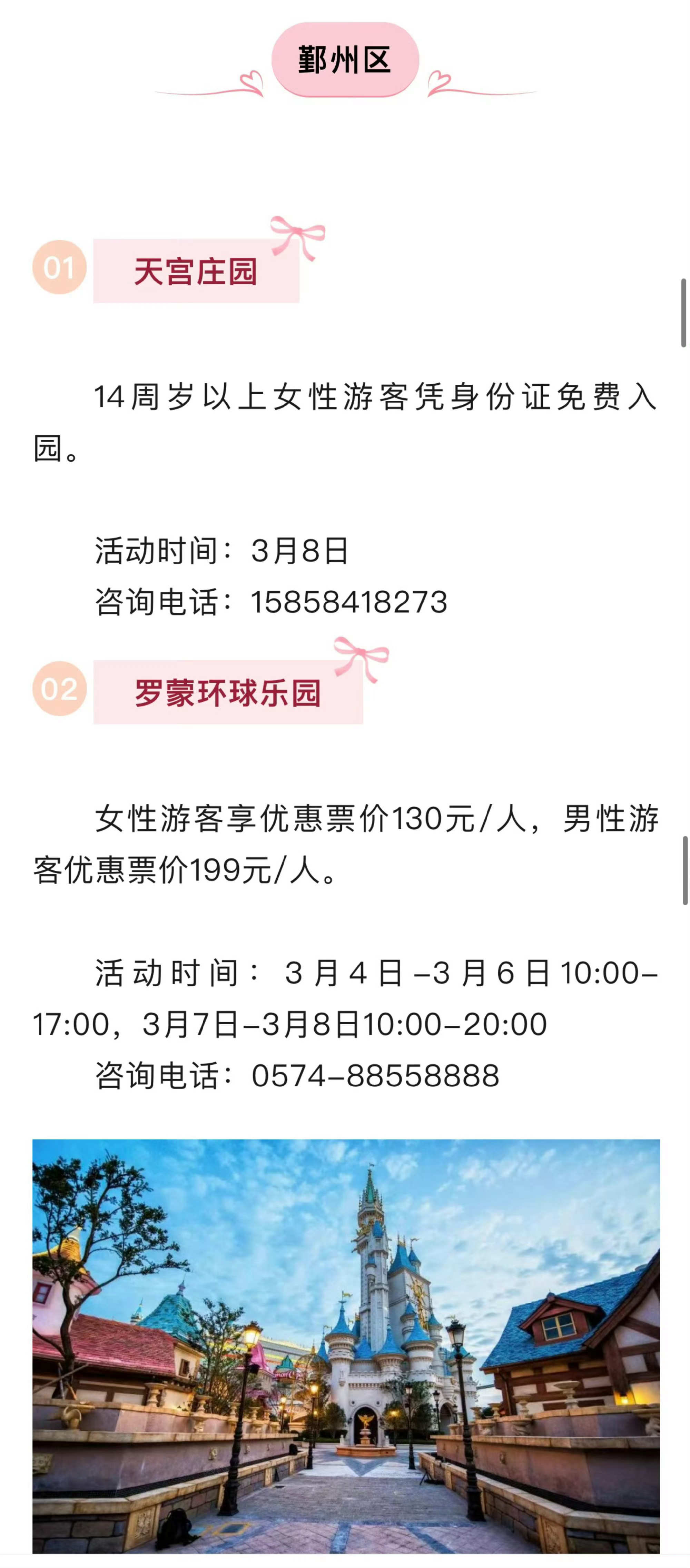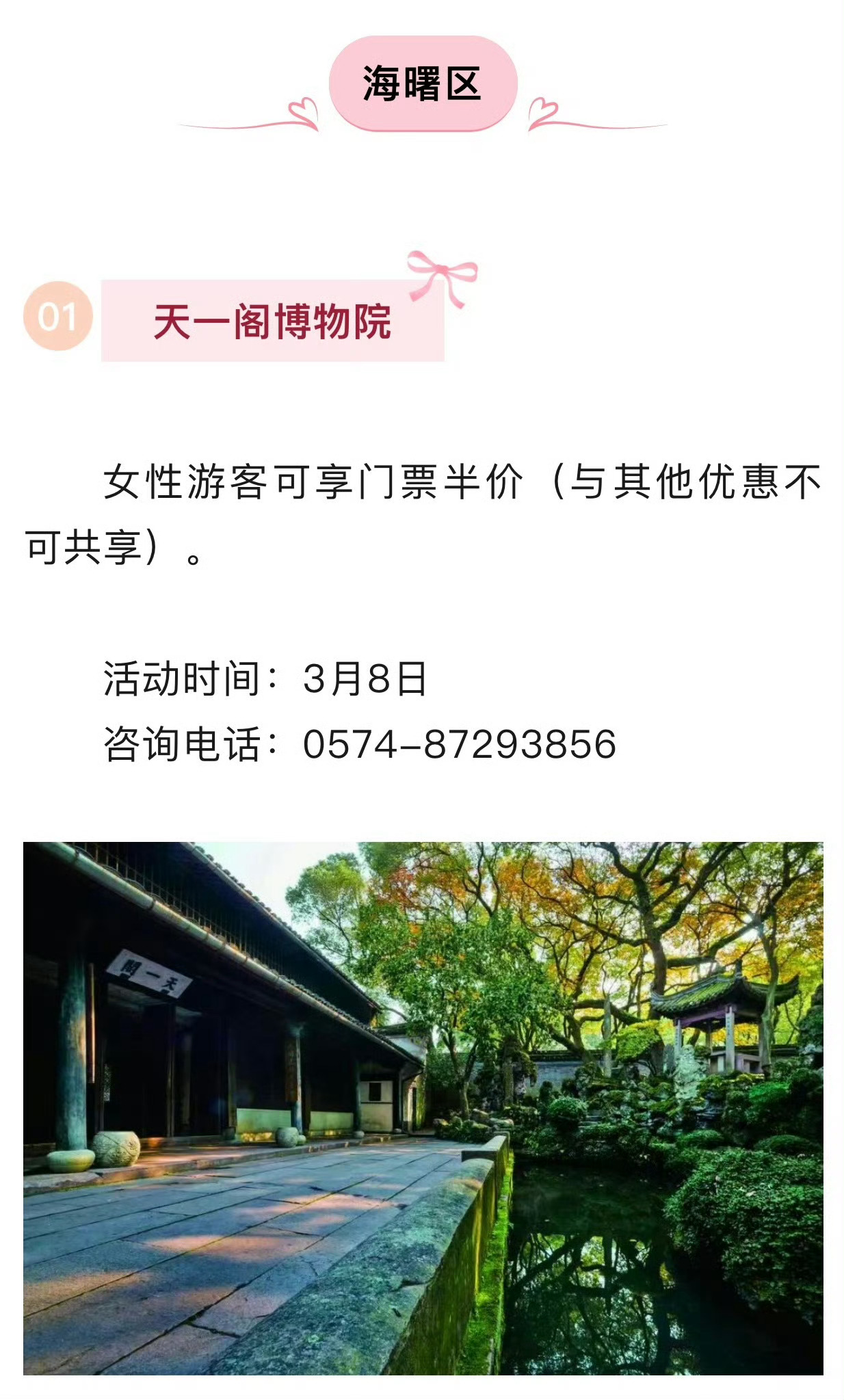 三八节宁波免费景点出游指南 姐妹们集合‼️三八节宁波出游指南🆓免费那种三八妇女节要来啦宁波一大波景区对女生放大招免费!半价!专属优惠!我为大家整理好啦快拉上闺蜜一起去打卡👇🌟海曙天一阁博物院|3.8 女生半价🌟江北慈城古县城|3.8 女生凭身份证免门票达人村|3.8 女生免首道门票[赞R]绿野欢乐谷|3.8 14岁以上女生免门票🌟镇海九龙湖旅游区|即日-3.10 “穿越时空套餐”38元(原价60),还有手作体验+文创礼品限量送🌟北仑九峰山、梅山湾沙滩公园| 3.7-3.15 女生免门票,拍照集赞还能抽奖万博鱼·ANCUN|3.7-3.8 所有项目3.8折爱尚梅山湾皮划艇基地明月湖度假营地|即日-3.31 团队游200元/位(吃+玩)爱尚十环皮划艇基地|即日-3.31 团队优惠200元/位🌟鄞州天宫庄园|3.8 14岁以上女生免门票罗蒙环球乐园|3.4-3.8 女生130元,男生199元🌟奉化奉化博物馆|3.8 18岁以上女生手作体验(需押金)溪口-滕头景区|3.6-3.30 女生订酒店免门票(付30元交通费)🌟余姚化安山阳明温泉|即日-3.31 女生套餐200元/位四明山国家森林公园|3.8 18岁以上女生门票半价、住宿6折丹山赤水|3.7-3.8 女生及属马🐎游客门票半价🌟慈溪达蓬山亲子乐园|3.7-3.9 女生及父母门票6折上林湖青瓷文化传承园|3.6-3.8 消费满188送玫瑰🌟宁海伍山石窟|3.7-3.8 女生门票38元梁皇山|3.7-3.8 女生半价,属马女生免门票🌟象山石浦渔港古城、中国渔村|即日-3.15 女生优惠价38元🌟前湾新区宁波方特|3.4-3.31 所有游客140元杭州湾湿地公园|3.8 女生38元宁波鲸途海洋乐园|3.7-3.8 18岁以上女生38元🌟东钱湖宁波野生动物园|女生138元,70岁以上38元;90天卡238元8⃣️号正好是周末快约上姐妹冲呀🌸寻美浙江同城热点创作计划