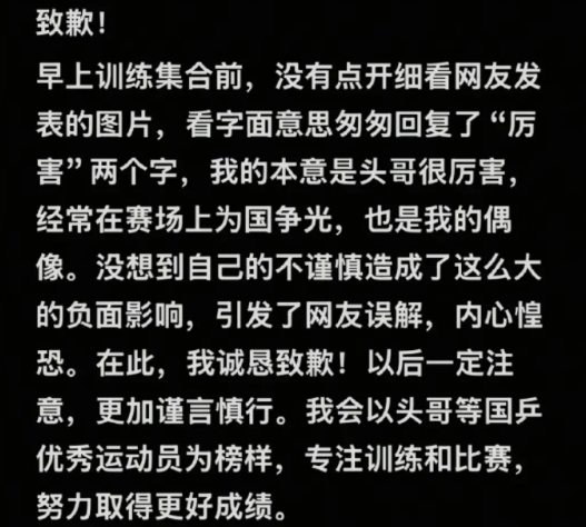 祝佳祺在社媒发文致歉:“早上训练集合前,没有点开细看网友发表的图片,看字面意思匆匆回复了"厉害”两个字,我的本意是头哥很厉害,经常在赛场上为国争光,也是我的偶像。没想到自己的不谨慎造成了这么大的负面影响,引发了网友误解,内心惶恐。”