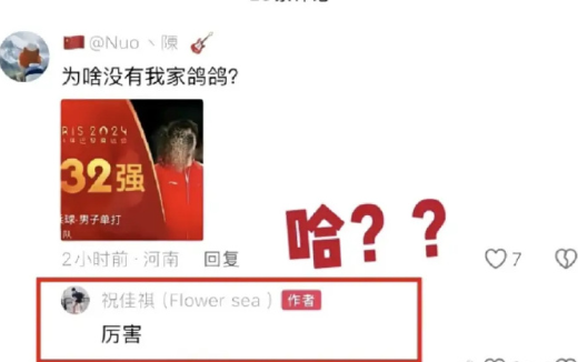 昨日,祝佳祺在社媒发了一段自己参加比赛的视频。随后,有网友在评论区晒出了王楚钦在巴黎奥运会上止步男单32强的结果截图,同时提问:“为啥没有我家鸽鸽?”