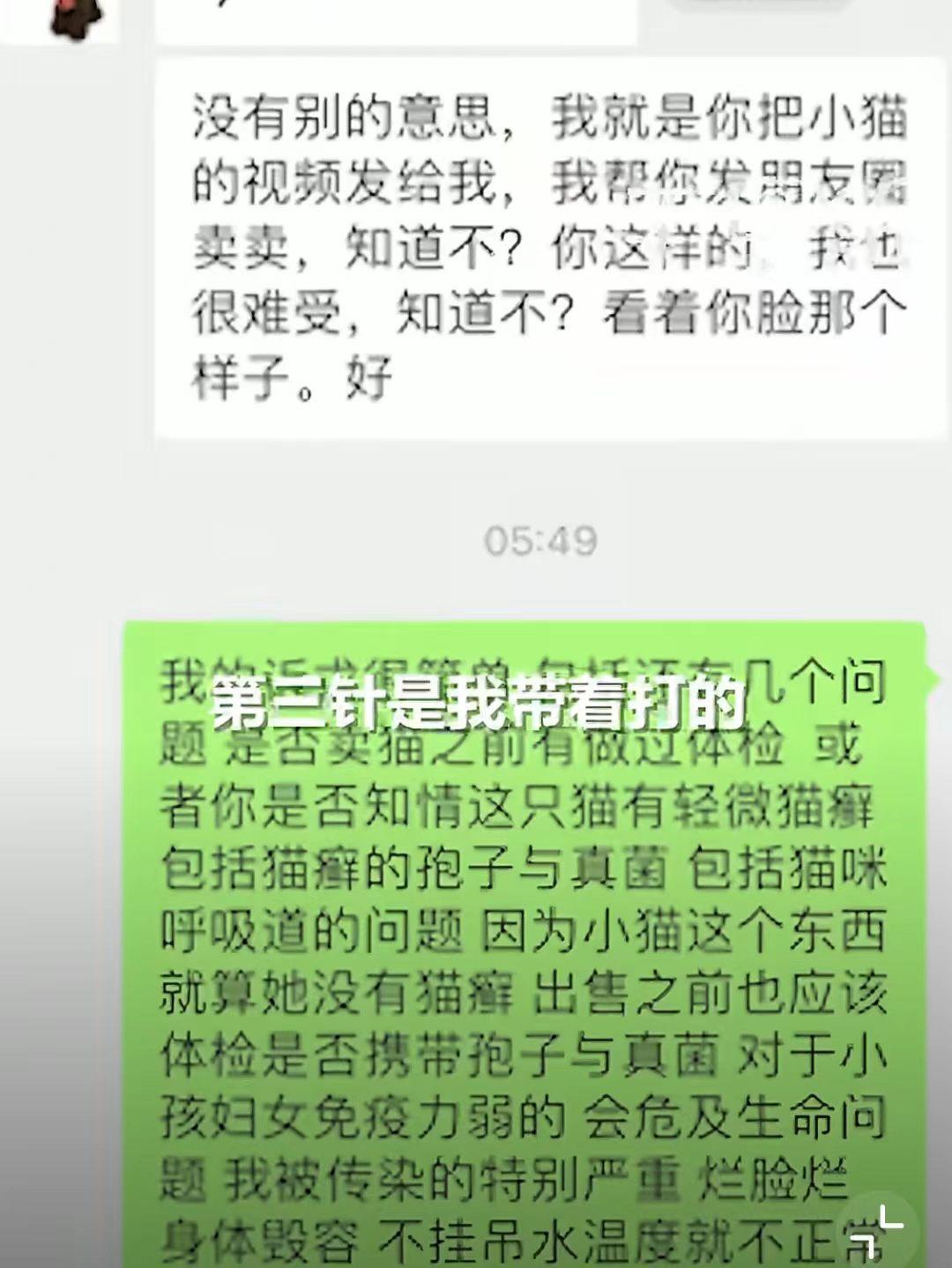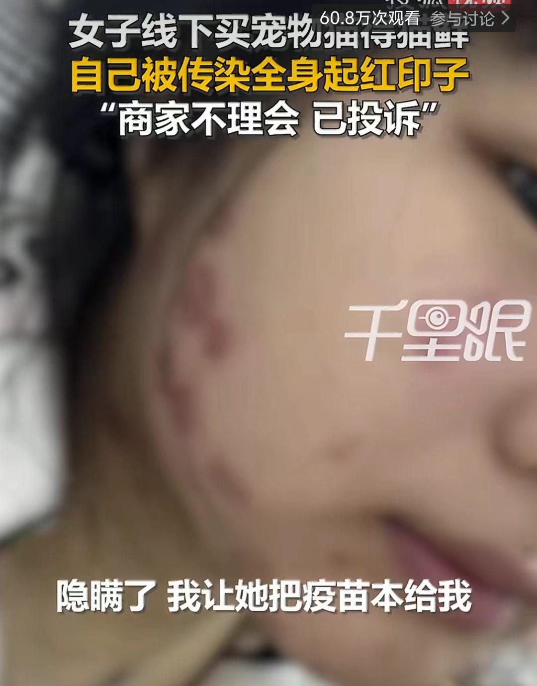 真是得不偿失。 江苏连云港。唐女士庆祝自己18岁,就花了800元在实体店买了一只猫作为生日礼物。 一周后,唐女士脸上身体都出现了皮肤溃烂,确诊为猫癣感染。 商家直接说不知道猫患有猫廯,这是借口吗? 宠物店不应该首先保证自己售卖的宠物是健康的吗? 宠物店的宠物不是按时要打疫苗、驱虫、体检的吗?难道体检时没查出来有猫廯,还是说平常就没有给宠物体检、驱虫呢? 宠物店最后妥协说,可以带去小诊所看病,小猫也帮忙转卖。 太可怕了,不想着怎么挽救自己的失误,还想着把小猫给转卖了,这是明知道这猫有病还想卖了赚钱啊!根本不顾别人的身体健康了吗? 生意在怎么不好做也不能赚这害人的钱。 因为唐女士没有同意商家的提议,商家直接不理人了。 这是想赖账了? 最后建议: 1.购买宠物时,要选择正规渠道,要求商家提供书面健康证明,尽量签订健康质保合同。 2.到宠物医院体检,排查疾病。