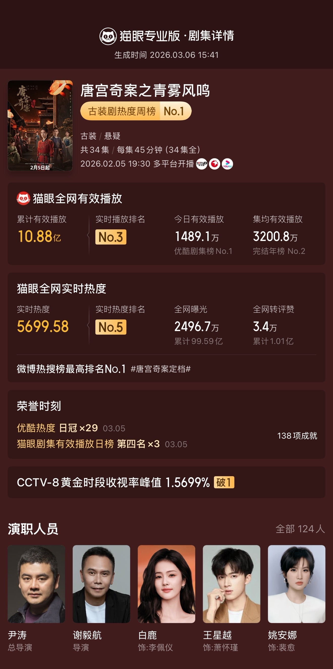 唐宫奇案之青雾风鸣豆瓣开分7.0 领衔主演电视剧《唐宫奇案之青雾风鸣》豆瓣开分7.0分。据猫眼专业版数据,截至当前全网有效播放量已超10.88亿。唐宫奇案豆瓣开分7.0
