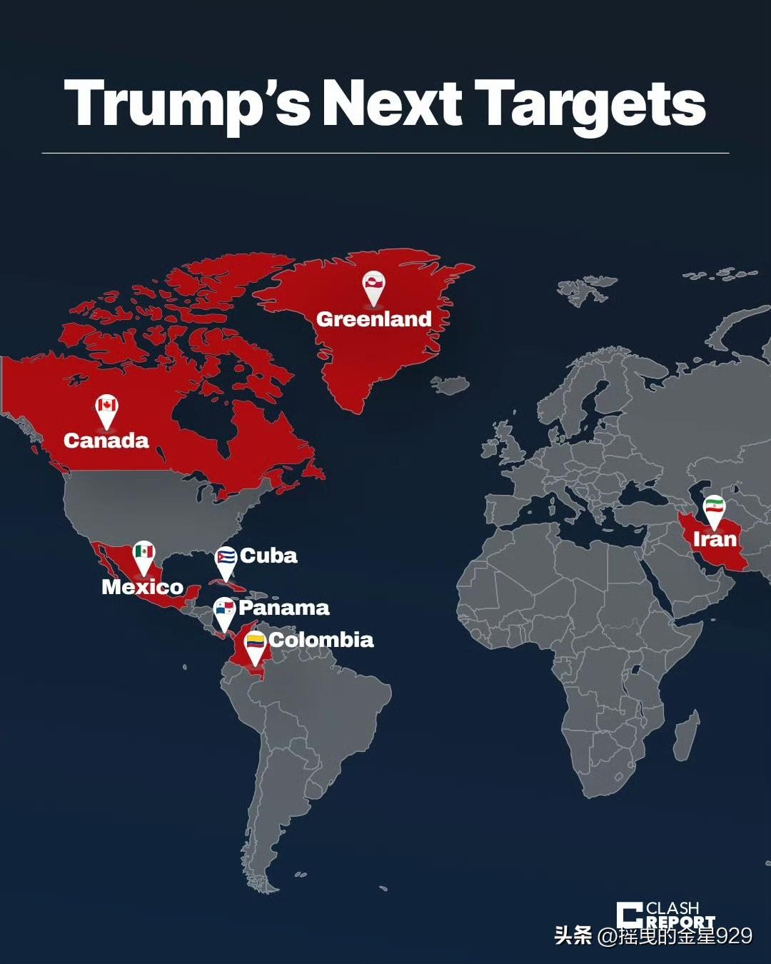 如果特朗普伊朗🇮🇷这一题做不好。 换下一题做,会是谁? 🇬🇱 格陵兰( 🇩🇰 丹麦),🇨🇺 古巴,🇮🇷 伊朗, 🇲🇽 墨西哥, 🇨🇴 哥伦比亚, 🇵🇦 巴拿马, 还是……🇨🇦 加拿大?