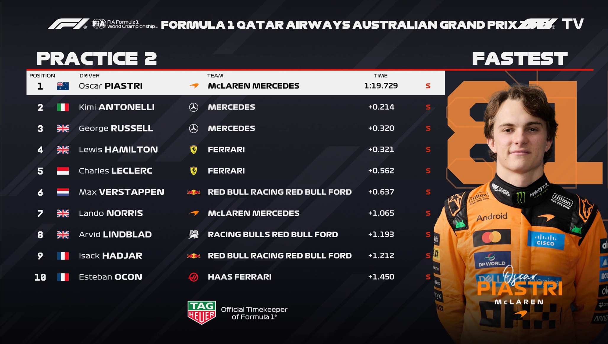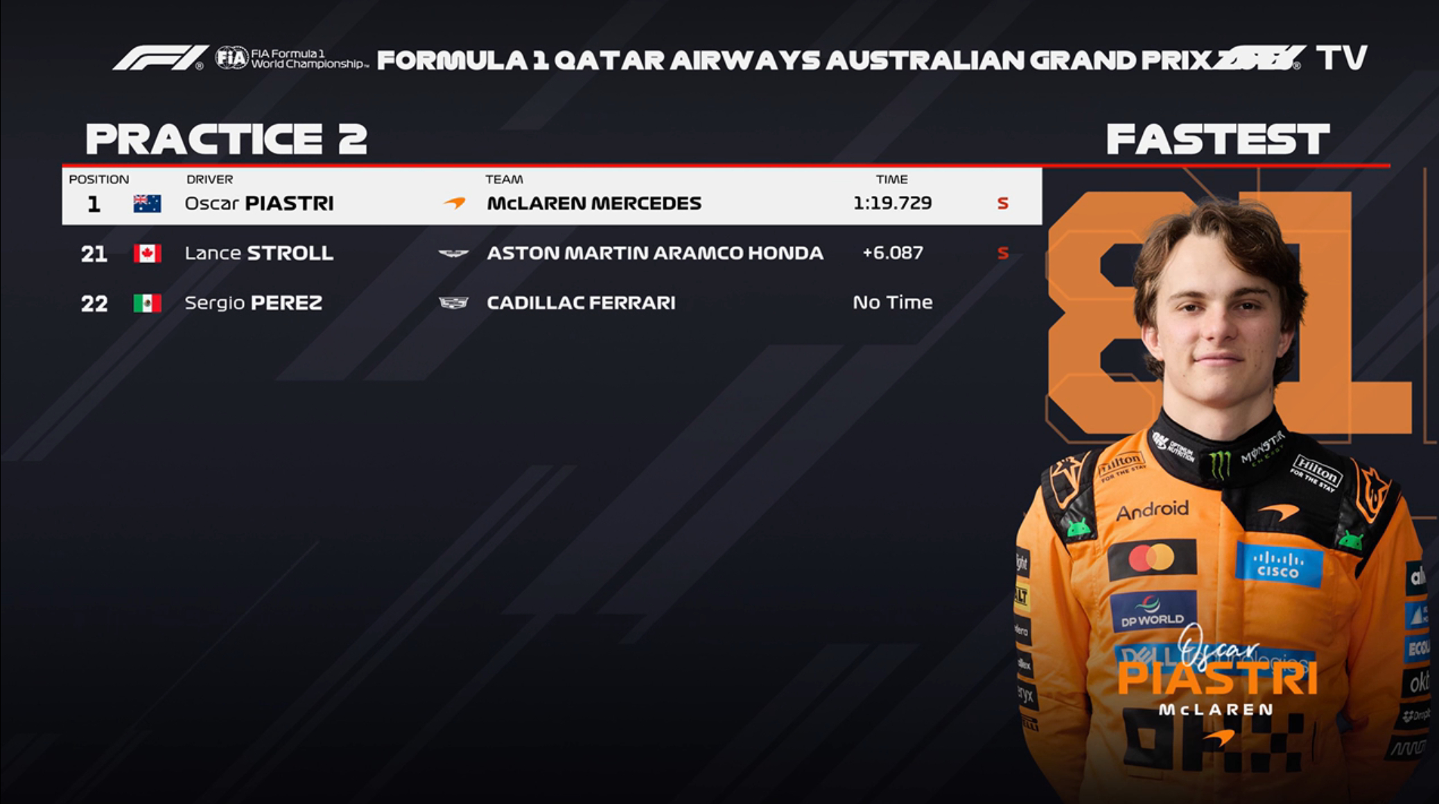 F1澳大利亚FP2成绩:皮亚斯特里最快,梅奔2-3,法拉利4-5