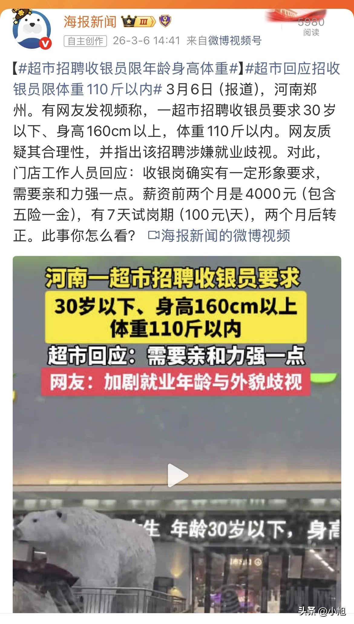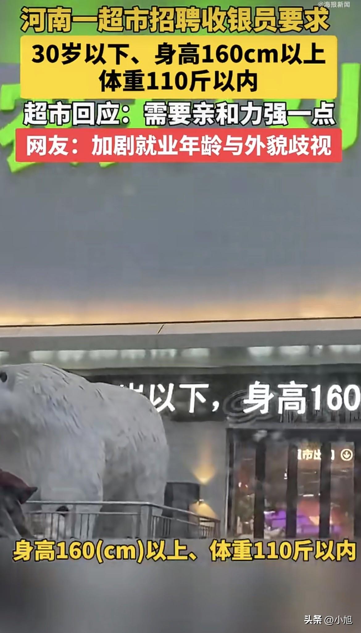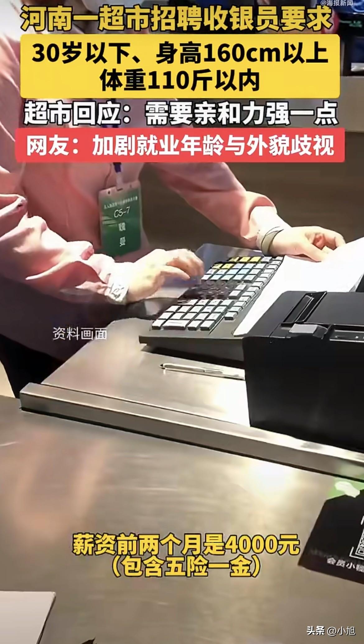 郑州有家超市招个收银员,要求30岁以下,身高1米6以上,体重不能超过110斤。 有网友把招聘信息拍下来发到网上,问大家这到底合不合理。 有人当场算了笔账,1米6的个子110斤,稍微骨架大一点、结实一点的姑娘,直接就被卡在门外了。 工作人员倒是挺实在,出来回了话,说收银这个岗位确实有形象要求,得亲和力强一点。 前两个月工资4000块,五险一金都含在里面,有7天试岗期,一天100块。 这话听着没毛病,但细品下来,总觉得哪里不对劲。 收银员的核心技能是啥?算账利索、态度好、能吃苦站一天。 什么时候亲和力跟身高体重划等号了? 说白了,这不就是把干活和长相硬扯到一起吗。 4000块在郑州真不算高,还包含五险一金,扣完到手也就三千出头。 用这个价钱招人,还要挑三拣四卡外貌,确实有点说不过去。 有人在评论区问了一个问题,直接扎心了—— 如果招的是收银员,那收银台后面到底坐的是人,还是个展示品? 这个问题问得挺狠,但也问到了点子上。 超市门口摆俩迎宾的,要形象好气质佳,大家还能理解,毕竟是门面。 但收银员是干啥的?是扫码、收钱、装袋、找零,一天站下来腰都直不起来。 这么个岗位,为啥非得把体重卡死在110斤? 再说这个110斤,到底是谁定的标准?怎么量?早上空腹量还是吃完饭量? 有网友调侃,是不是上班前还得先上个秤,超了直接扣钱? 听起来像开玩笑,但细想一下,这种条件摆在那,无形中就是一种压力。 胖一点的姑娘看到这条招聘,压根不会去投,觉得自己不够格。 哪怕她手脚再麻利、态度再好、经验再丰富,都被这一条挡在门外。 这不就是把人往容貌焦虑那条路上逼吗。 有人可能会说,企业想招什么样的人,是人家的自由。 这话没错,但自由也得有个边界。 你把年龄卡在30岁,把体重卡在110斤,等于直接把一大部分人排除在外。 这些人不是没能力,只是不符合你那个“看着顺眼”的标准。 问题是,顾客去超市是买东西的,又不是去看脸的。 收银员扫码扫得准、态度温和、不甩脸子,比啥都强。 长得好看能当钱花吗?能扫码吗?能找零吗? 再往深了想,这种招聘逻辑背后,其实藏着一个挺残酷的现实—— 人正在被当成商品来挑。 不是看你有多大本事,是看你看起来像不像那么回事。 胖了不行,老了不行,长得不够精致也不行。 一套标准下来,把人分成三六九等,能过关的才有资格进去干活。 那些被筛掉的,可能比过关的更能干、更踏实、更想好好干。 但没用,第一眼就没过,连展示的机会都没有。 有人把这个叫形象管理,叫品牌调性。 说白了,就是不想让长得不够“标准”的人站在那儿。 那问题来了,谁有这个资格来定这个标准? 凭什么用一把尺子量所有人? 更现实的问题是,现在的年轻人找工作本来就不容易。 学历卷完卷经验,经验卷完卷年龄,年龄卷完卷长相。 一步跟不上,步步被淘汰。 30岁是个坎儿,110斤是个坎儿,1米6也是个坎儿。 一个个坎儿堆起来,普通人还有多少路能走? 回头再看这条招聘,4000块工资,7天试岗,五险一金都含在里头。 条件不算好,门槛倒是不低。 像极了那种相亲局——自己条件一般,挑对方倒是挺来劲。 这事你怎么看。 是商家有自己的考量,还是这标准确实过了。 欢迎来评论区聊聊。