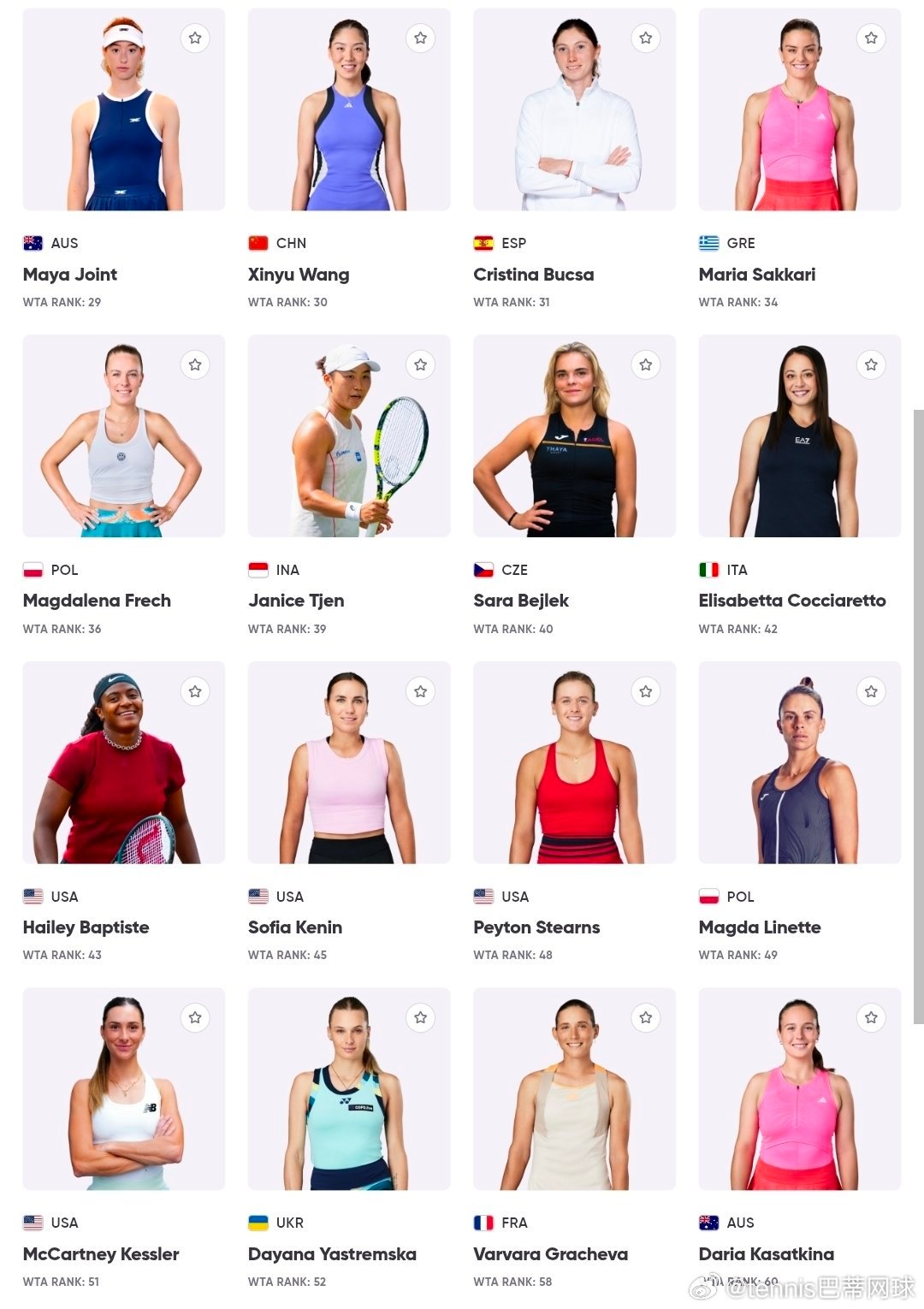 查尔斯顿站的参赛阵容一如既往地强大。佩古拉、阿尼西莫娃、王欣瑜🇨🇳,亚历山德罗娃、本西奇、凯斯和约维奇领衔出战,世界排名前30的选手中,有14位都参加了比赛。