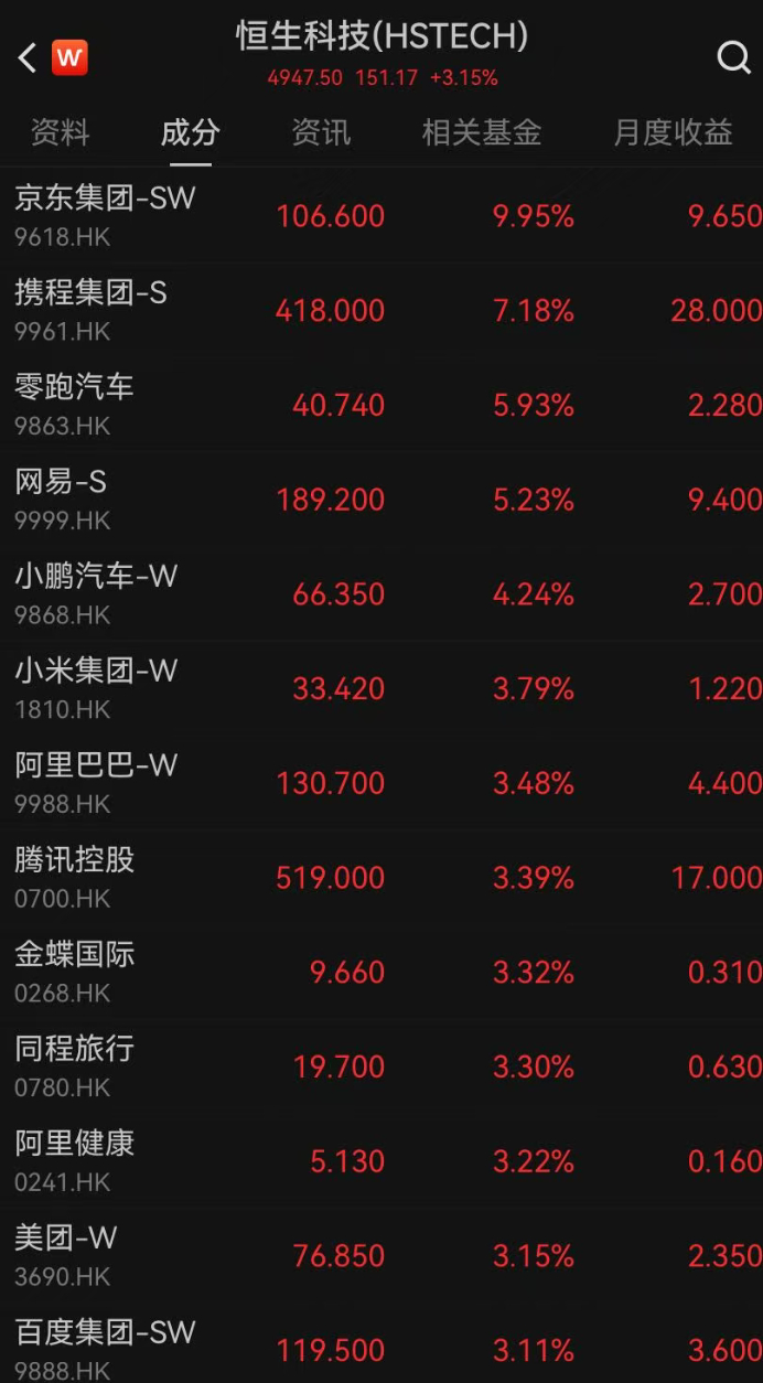 【#港股互联网龙头股价飙升#】 #港股京东物流暴涨23%# 3月6日,港股收盘大涨。恒生指数涨1.72%,恒生科技指数涨3.15%。互联网龙头大涨,京东涨10%,携程涨7%,网易涨5%,腾讯控股、阿里巴巴、小米集团、百度、美团涨超3%。另外,京东物流暴涨23%。