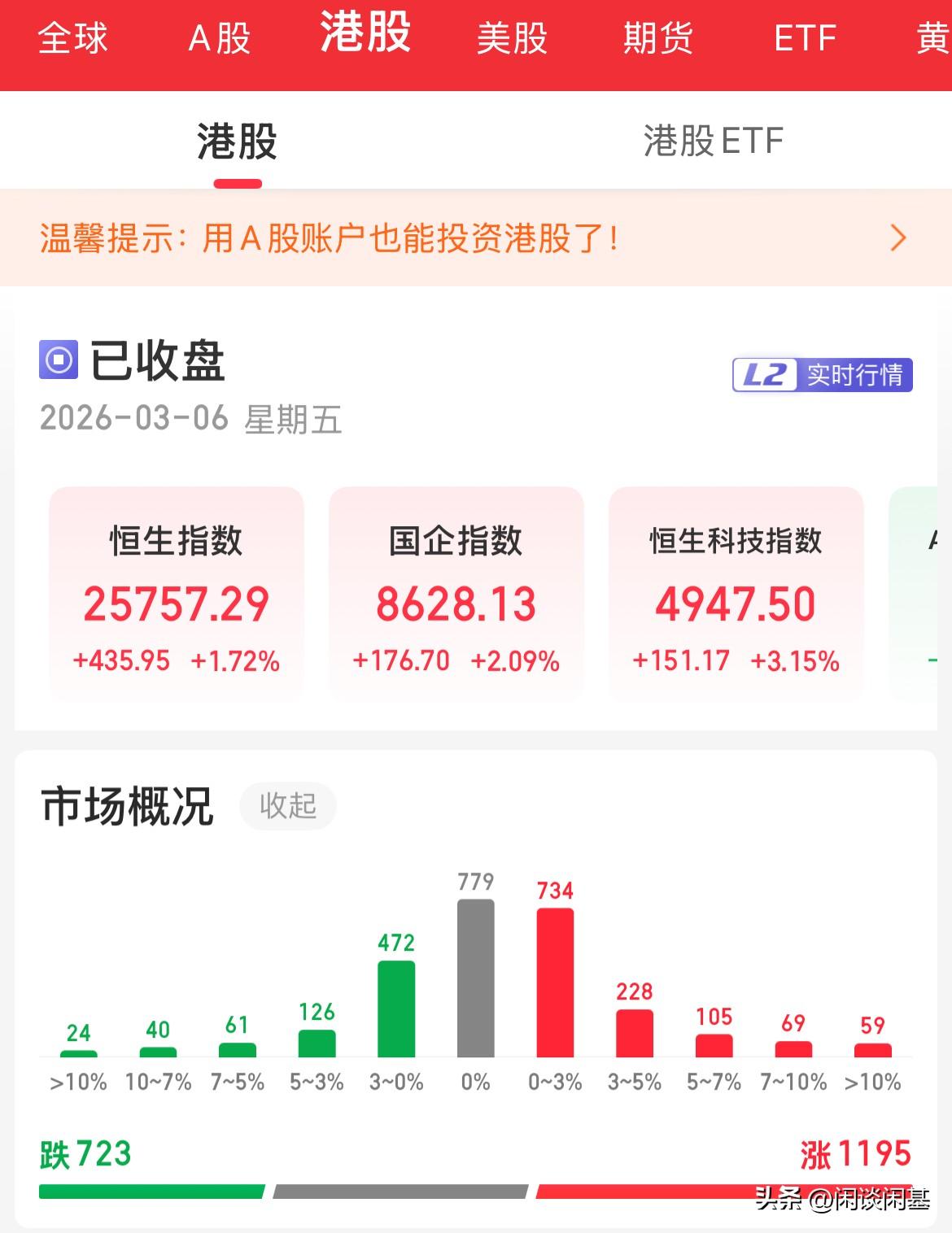 硬了一把,给了一粒糖,是止跌反弹还是下跌的中继,都是个迷,内资反而今天卖出了21个亿港元,抄不完的底,然后这会卖出了 算是一根大阳线,恒生科技涨幅3.15%,两大巨头腾讯涨幅3.39%,阿里巴巴涨幅3.48%,今天没冲高回落,走势也是稳步震荡,午后有所回落, 3月的第一周,恒生指数跌幅3.28%,恒生科技跌幅3.70%,在中东局势冲突加剧的背景下,全球资本本周都表现欠佳, 2026年以来恒生科技累计跌幅11%,恒生指数累计涨幅0.49%,看下周能不能来个修复性行情啊。