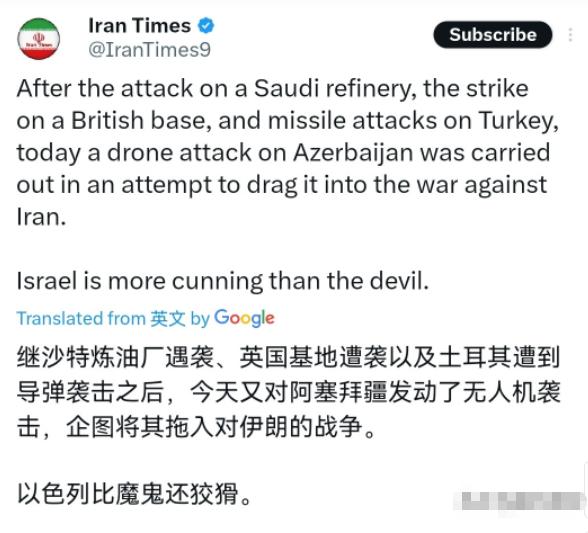 没想到以色列玩的这么阴!3月5日,伊朗时报表示,继沙特炼油厂遇袭、英国基地遇袭、土耳其遭导弹袭击之后,今天又对阿塞拜疆实施了无人机袭击,以色列企图将这些国家拖入对伊朗的战争。以色列比魔鬼更狡猾。很显然,伊朗媒体的报道,传递的是什么信息呢?一句话,那就是以色列正在趁乱对伊朗进行栽赃陷害。 先说沙特那边,3月2号的时候,沙特阿美旗下的一座炼油厂遭到了无人机袭击,现场还起了火,虽然火势很快被控制住,没造成人员伤亡,但还是让沙特这边紧张不已。 袭击刚发生,还没等沙特官方拿出调查结果,西方的主流媒体就先跳出来“定罪”,CNN、BBC这些媒体都引用所谓的“匿名消息源”,明里暗里暗示伊朗就是幕后黑手,甚至还放出卫星图片,声称在伊朗境内发现了导弹发射的痕迹。紧接着,一批所谓的地区分析人士也跟着跟风,把理由说得头头是道,一时间全网都是指责伊朗的声音,仿佛伊朗真的就是这次袭击的始作俑者。 可事情的反转来得比大家预想的都快,沙特和卡塔尔的安保人员在现场查获了不少东西,有足量的C4塑胶炸药、远程引爆器,还有伪造的沙特本地工人身份文件和炼油厂内部布局图。经过审讯才知道,这根本不是伊朗干的,而是以色列摩萨德特工精心策划的一场阴谋。 这些特工早就做好了万全准备,一旦爆炸成功,现场根本找不到任何指向以色列的痕迹,到时候伊朗就算有一百张嘴,也说不清道不明。伊朗方面在袭击发生后不到3小时,就通过直播发布声明,明确否认和这次袭击有关,还表示愿意配合沙特的调查证明自己的清白,可这番澄清在当时一边倒的舆论里,根本没人愿意听,反而被不少人嘲讽是狡辩。 紧接着,英国在塞浦路斯的阿克罗蒂里空军基地也遭了殃,事发在3月1日午夜到2日凌晨,一架无人机袭击了这座基地,造成了有限损失,之后还有两架无人机飞向基地被成功拦截。 袭击发生后,路透社等媒体就报道称,第一架来袭的无人机是伊朗制造的,来自黎巴嫩方向,一下子就把矛头又指向了伊朗。可大家不知道的是,就在英国首相斯塔默宣布同意美军使用英国基地对付伊朗后没多久,基地就遭到了袭击,这背后很难说没有以色列的影子,毕竟以色列一直想拉拢英国一起针对伊朗,这么一闹,英国很容易就会把怒火撒到伊朗身上。 随后,土耳其那边也出现了状况,当地时间3月4日,土耳其国防部发表声明,说一枚从伊朗发射的弹道武器,穿越伊拉克和叙利亚领空后向土耳其领空飞行,被北约的防空反导系统及时拦截摧毁了。 土耳其外长很快就致电伊朗外长提出正式抗议,还召见了伊朗驻土耳其大使,表达不满。北约发言人也站出来谴责伊朗的行为,可实际上,没有任何确凿证据能证明这枚导弹就是伊朗故意发射的,更像是有人故意引导,让土耳其认为伊朗在针对自己,而这背后的推手,依然是以色列。毕竟土耳其是北约成员国,一旦土耳其和伊朗闹僵,就能进一步孤立伊朗,让更多国家站到伊朗的对立面。 到了3月5号,也就是伊朗时报报道的当天,阿塞拜疆又出了事,当地的纳希切万国际机场遭到无人机袭击,两架无人机坠毁,造成两人受伤,机场建筑也受到了损坏。阿塞拜疆方面立刻发表声明谴责,还召见了伊朗驻阿塞拜疆大使,认定是伊朗发动的袭击。 可伊朗武装部队总参谋部当天下午就发布公告,明确否认向阿塞拜疆发射无人机,还强调伊朗尊重所有国家,指责以色列企图通过这种方式陷害自己。短短几天时间,四个国家接连遭遇袭击,每一次都被有意无意指向伊朗,这绝对不是巧合,分明就是以色列在背后连环操作,一步步布局。 大家可能会疑惑,以色列为什么要费这么大的劲,搞这么多栽赃陷害的把戏。其实核心原因很简单,就是为了自己的利益。 而且以色列的策划特别周密,不仅在现场布置假证据,还准备了大量用于煽动舆论的宣传材料,包括伪造的伊朗袭击证据和支持恐怖主义的文件,就是要在舆论上彻底抹黑伊朗,让嫁祸的戏码更加逼真。要知道,这些年西方媒体一直在不断渲染“伊朗威胁论”,把伊朗塑造成地区不稳定因素,久而久之,不管中东出什么事,大家都会下意识把锅扣到伊朗头上,这也给了以色列可乘之机。 不得不说,以色列这一手玩得是真够阴的,比大家想象中还要狡猾。它不直接出面和伊朗对抗,而是躲在幕后,利用地区国家的矛盾,制造混乱、挑拨离间,把其他国家当成对付伊朗的棋子,自己则坐山观虎斗。可纸终究包不住火,不管以色列的策划多周密,只要是阴谋,总有被揭穿的一天。现在已经有部分证据指向以色列,相信随着各国调查的深入,以色列的真面目迟早会被彻底曝光,到时候它终将为自己的所作所为付出代价。毕竟,任何试图通过制造混乱、嫁祸他人来实现自身利益的行为,终究不会得到好结果。