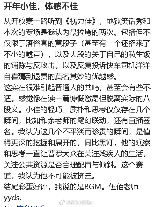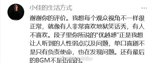 小佳回复网友评价 有网友看了小佳的脱口秀发布观后感:“开年小佳,体感不佳”,但在结尾夸了彩蛋的bgm:“伍佰老师yyds.”小佳回复:“单口喜剧不是只有负责使命,也在发现问题。还有最后的BGM不是伍佰的。”观众再回复小佳:“我一直为你的幸运和才华觉得开心,同样希望你在决定表达之前,能更谦逊地观察与调查。因为这个世界实在是不乏太多从其他角度走的更远、看的更多的人。比如如果你愿意搜一下这首创作于1998年的《来去夏威夷》的更多信息,你会发现,作曲人叫吴俊霖,彼时他已经以伍佰的艺名创作了8年。”