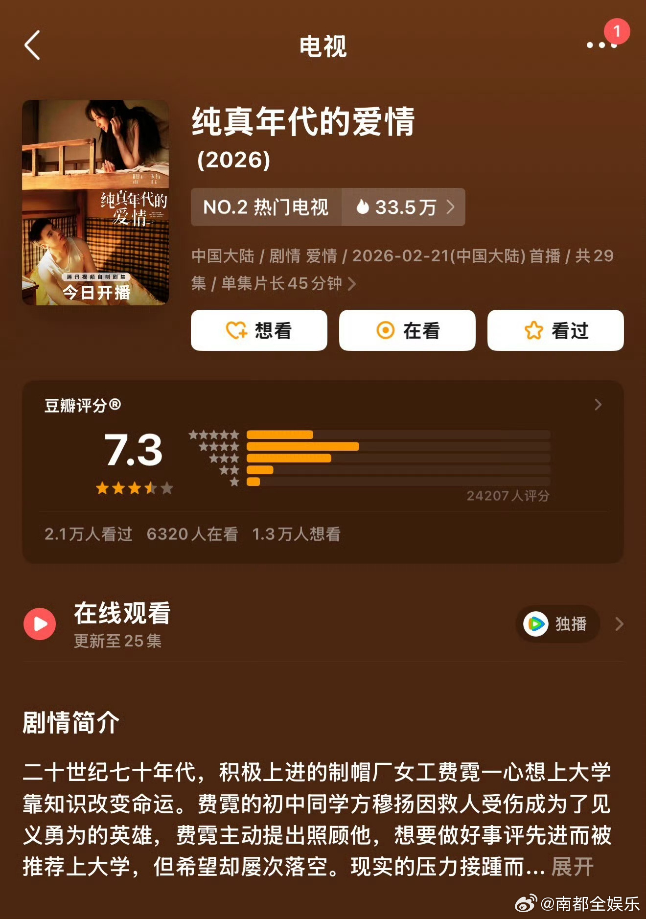 纯真年代的爱情豆瓣开分7.3今日,由陈飞宇、孙千主演的电视剧《纯真年代的爱情》豆瓣开分7.3。你追剧了吗?你打多少分?