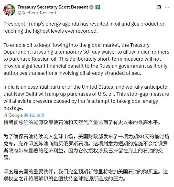 美国给印度30天豁免可以购买俄油 贝森特:美国财政部发布了一项为期30天的临时豁免令,允许印度炼油商购买俄罗斯石油。 (俄罗斯成最大赢家)