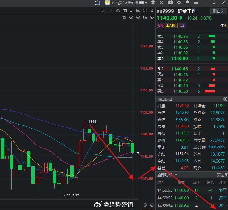 今天黄金是走了我A,B方案,A 走一半(1138附近空); 然后走B到1140上