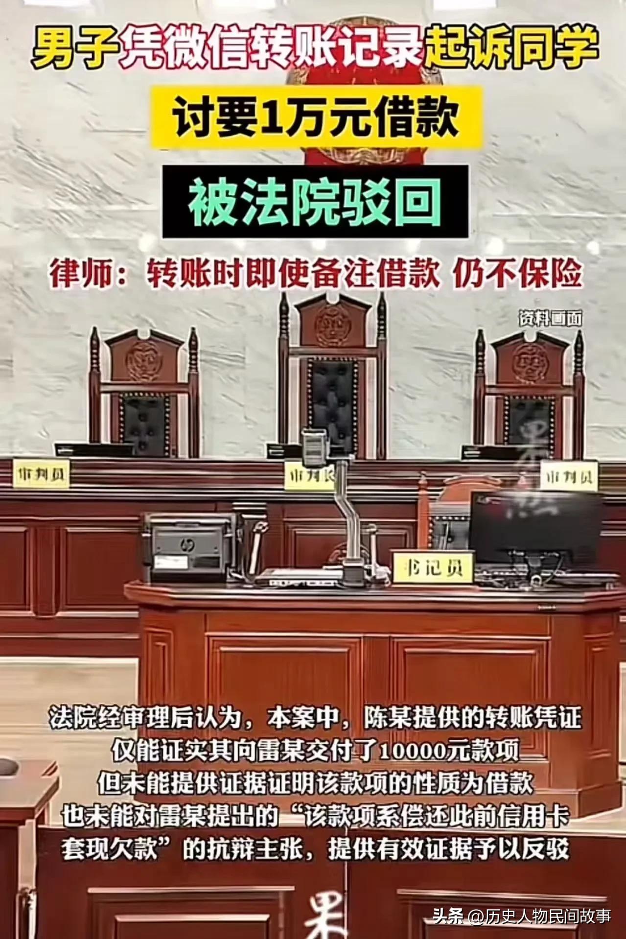 一、法院判决完全正规、合法 这是福建罗源法院的真实判例,判决完全符合现行法律规定。 网友质疑“法院正规吗”,是因为不了解民间借贷的两个法定成立要件: - 借贷合意(双方都认可这是借款,如借条、聊天记录、对方确认) - 款项交付(转账记录、收条等) 缺一不可 。 二、案件核心事实(为什么会输) - 同学雷某以还信用卡为由,向陈某借1万,陈某微信转账,没写借条、没聊天确认、没对方回复。 - 陈某起诉,只拿得出转账记录。 - 雷某当庭抗辩:这1万是陈某还我之前信用卡套现的钱,并拿出聊天记录证据。 - 陈某说“我已现金还过”,但拿不出任何证据。 - 法院认定:转账只能证明“给过钱”,不能证明是借款;陈某无法证明借贷合意,也驳不倒对方抗辩,驳回起诉。 三、律师提醒:转账备注“借款”也不保险 - 转账备注是单方意思表示,对方没确认、没回复,法律上不算达成合意 。 - 对方只要拿出证据证明是还款、货款、投资、赠与、合伙款等,法院大概率不采信你的单方备注 。 四、以后借钱,这样做才稳(必做3步) 1. 写借条/借款合同(关键):写清金额、用途、利率、还款时间、双方签字日期 。 2. 转账+备注+聊天确认:转账备注“借款”,并在聊天里让对方明确回复“收到借款,确认” 。 3. 保留全套证据:借条、转账记录、聊天记录、催款记录,长期保存 。 五、一句话总结 转账记录≠借款凭证,只有“合意+交付”双证据,才受法律保护。 素材来源于网络侵权删除