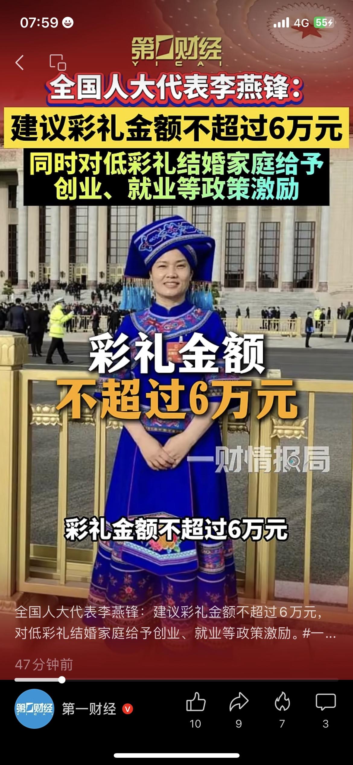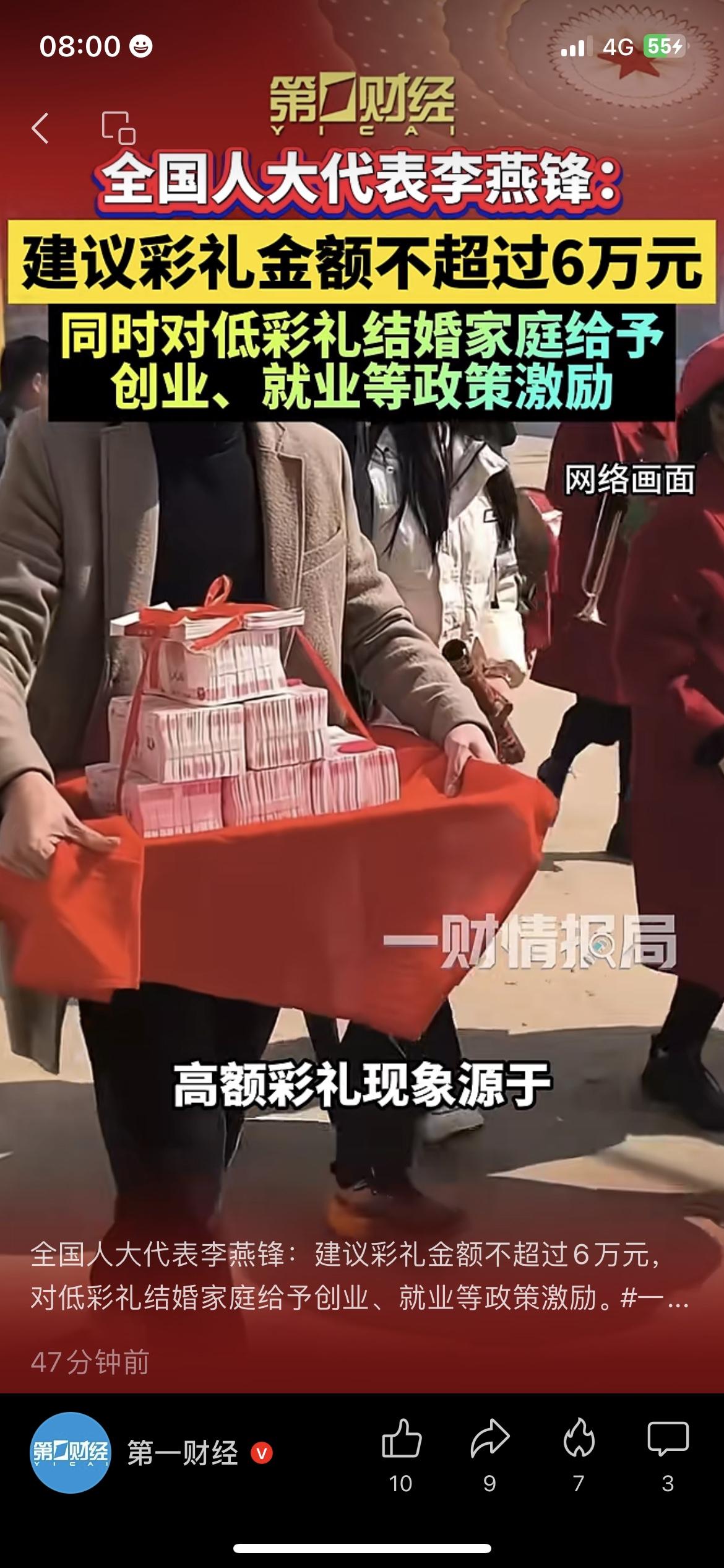 人大代表建议火了:彩礼不超6万,低彩礼家庭还给创业就业激励! 听完真的戳心,多少年轻人被彩礼压得喘不过气,谈婚论嫁变成谈钱论价。 身边朋友有的18万8彩礼全带回还倒贴首付,也有人因彩礼谈不拢,3年恋爱说散就散。 这个建议就是把彩礼拉回心意本位,不搞攀比、不绑架婚姻,既减负担又树新风。 对普通家庭来说,少花钱、多实惠,婚恋回归真心最重要。 彩礼新规 民生热点 婚恋观 年轻人结婚 政策激励 你们当地彩礼一般多少?评论区报个数。 婚姻彩礼观