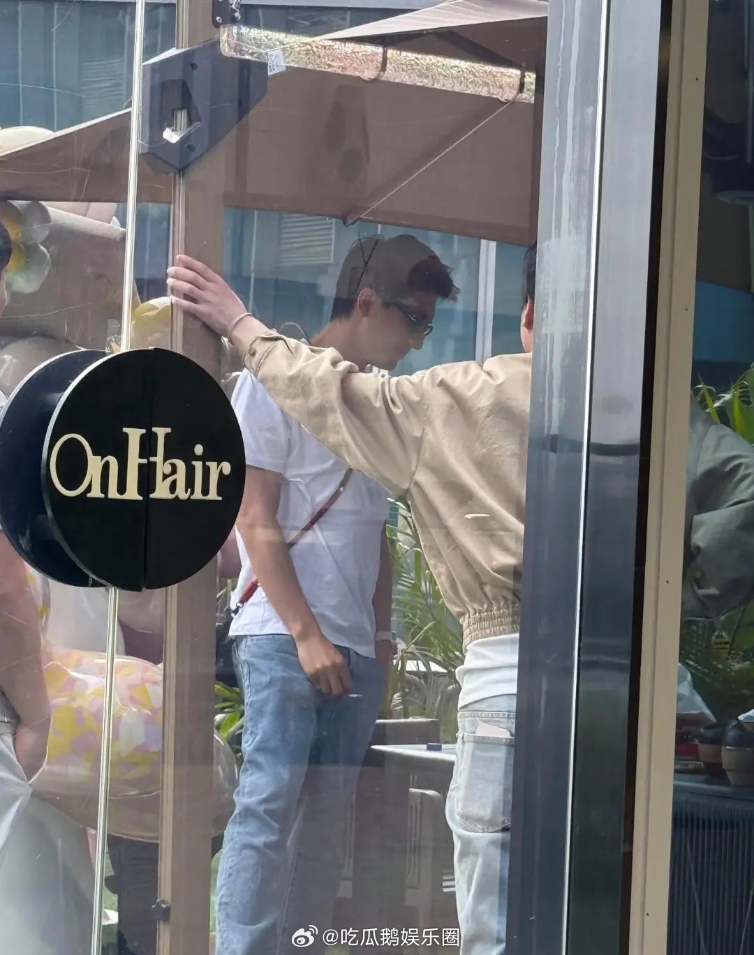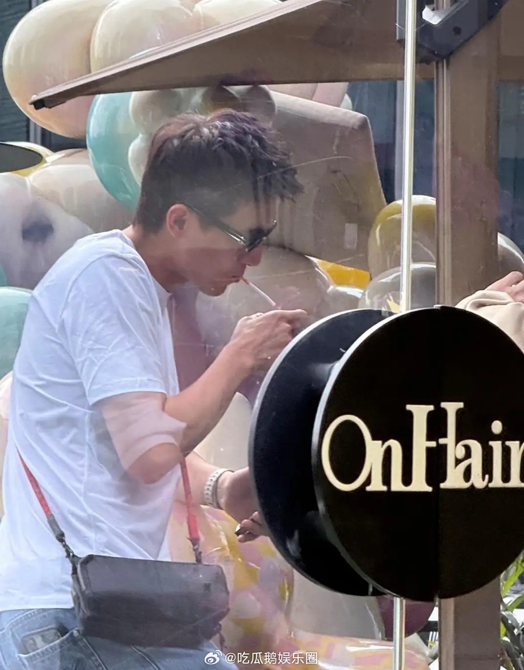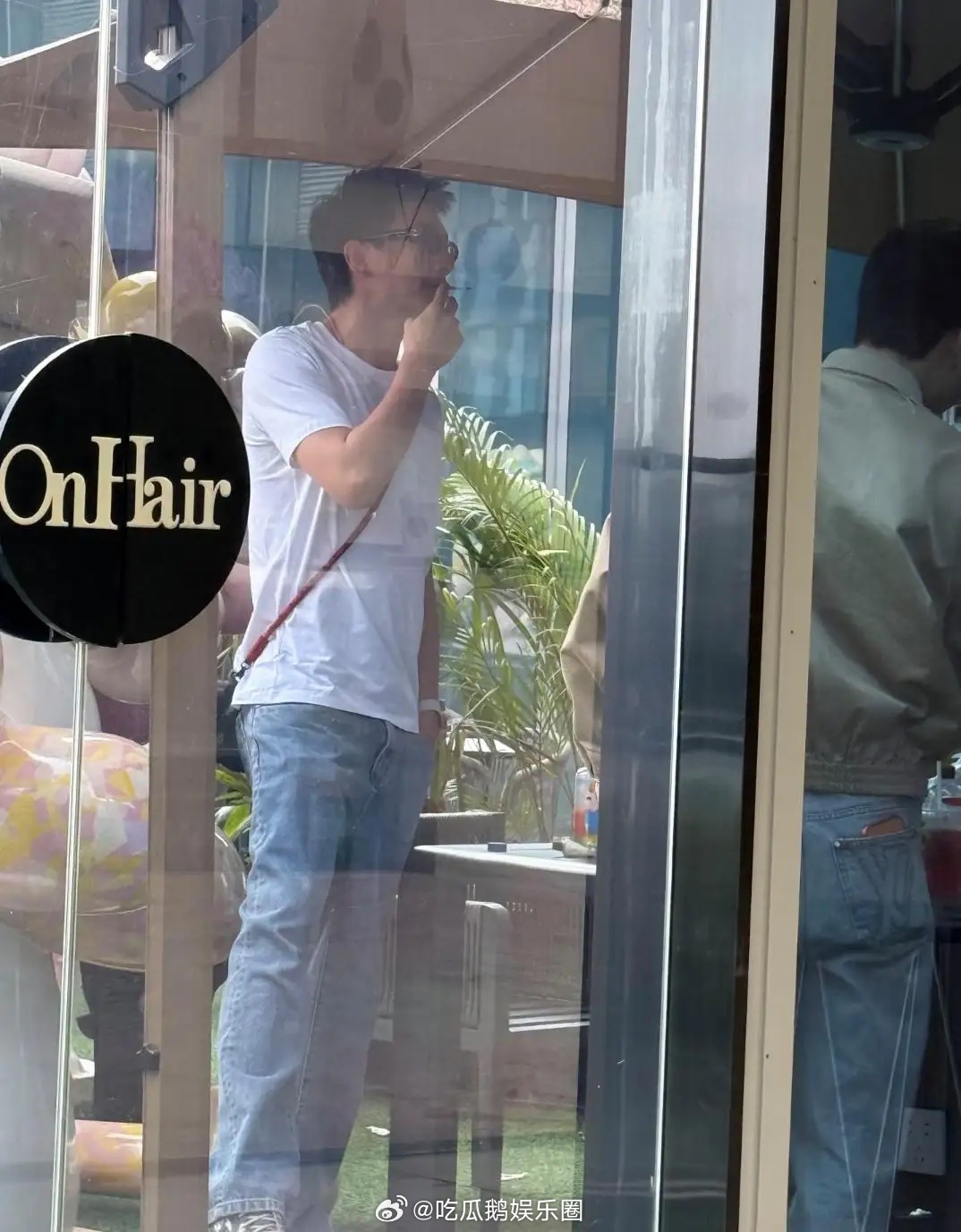 林更新和一帮朋友现身广东理发店,他打扮休闲,他身穿白色圆领T恤搭配浅蓝牛仔裤,脚踩灰色旅游鞋,肩挎小包,坐在橱窗边抽烟。