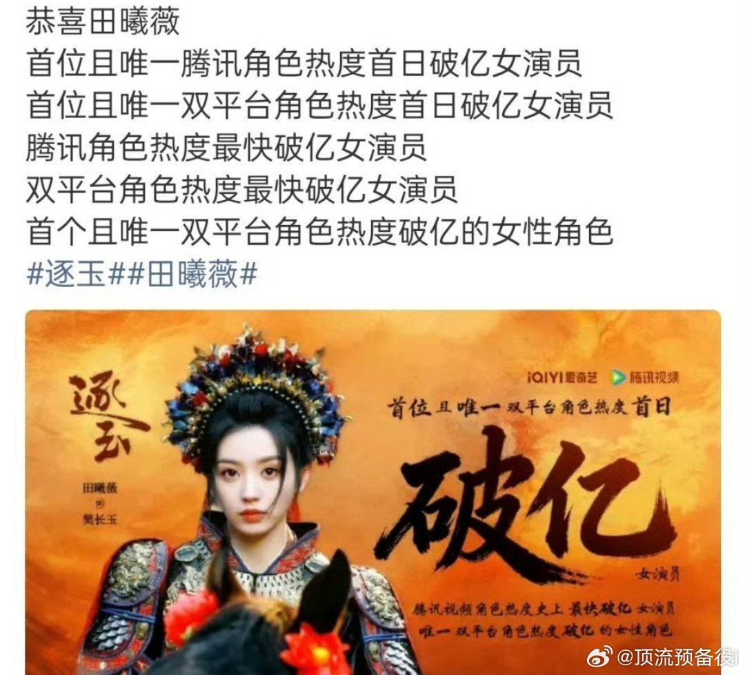 田曦薇樊长玉腾讯爱奇艺双平台角色热度破亿,哇哦小田上升势头明显