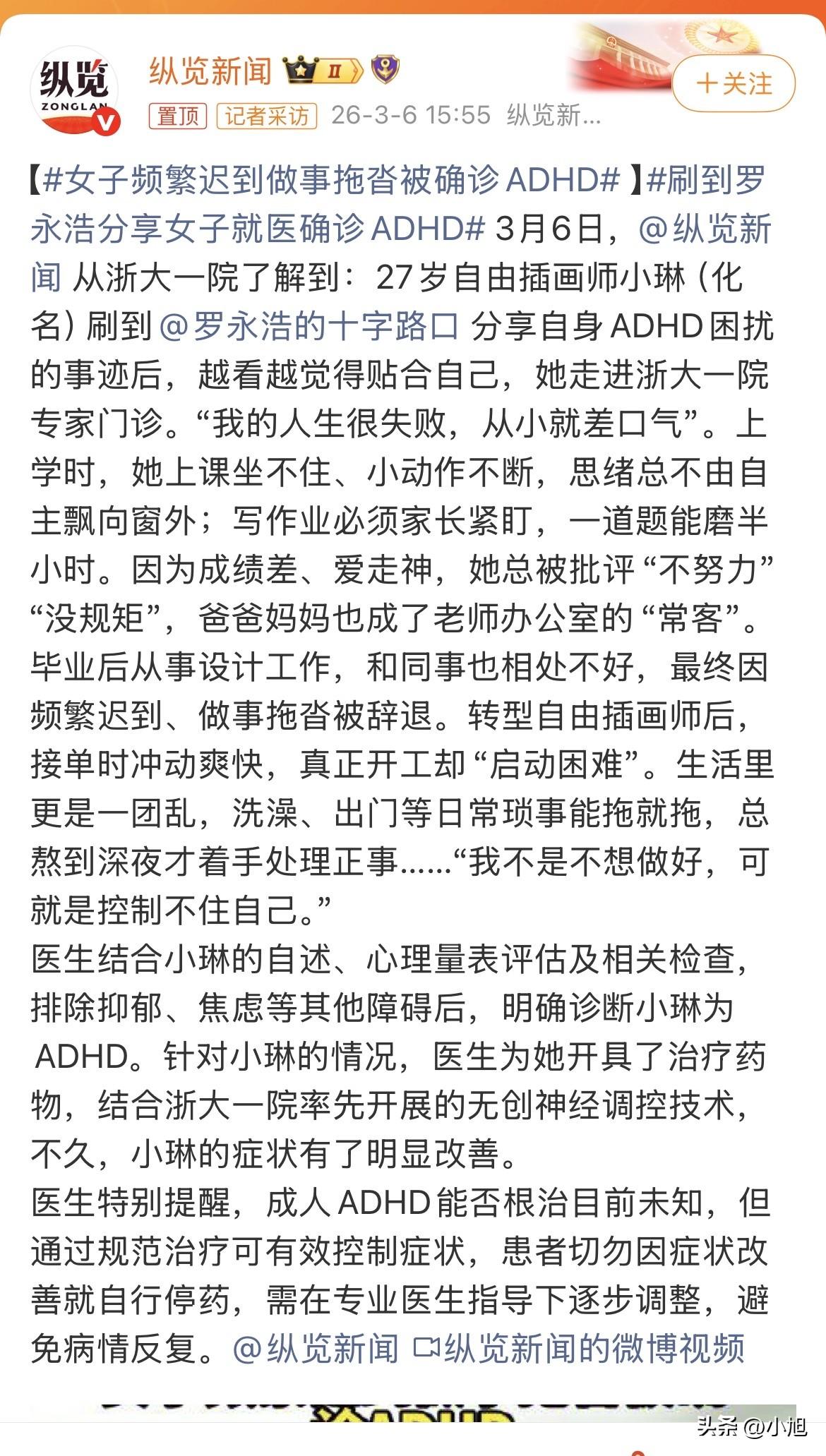 刷个手机刷出自己27年的病,杭州姑娘小琳就是刷到罗永浩讲ADHD的视频,越看越觉得后背发凉,这不就是在说我吗?她抱着试一试的心态去了浙大一院,结果真确诊了成人多动症。 医生告诉她,我国成人ADHD患病率大概在3.4%左右。也就是说,一百个成年人里,就有三四个人可能跟她一样。 小琳从小就是老师办公室的常客。上课坐不住,手里不玩点东西就跟要命似的。眼睛盯着黑板,脑子早就飘到操场上了。写个作业能磨蹭仨小时,家长得在旁边盯着,一走神她就发呆。 老师说她“不努力”“没规矩”,爸妈被叫去学校都觉得丢人。小琳心里苦:我真不是故意捣乱,就是控制不住自己啊。 这种情况一直持续到工作。做设计,同事交代的事转头就忘。领导开会讲什么,听着听着就走神了。最要命的是迟到,早上起床跟打仗似的,明明定了五个闹钟,还是能迟到。最后被辞退了。 医生说,成人ADHD的症状跟儿童不太一样。儿童多动是跑来跑去,成人多动是内心坐立不安,感觉静不下来。小琳说,她开会时表面坐着,心里像有猫抓一样。 转行做自由插画师后,问题更明显了。接单时特别爽快,脑门一热啥都答应。真到要画了,就跟凳子上有钉子似的,死活进入不了状态。客户催稿,她就熬夜赶,赶完又后悔为什么不早点动手。 这不是懒,医生说这叫执行功能障碍。大脑负责计划、组织、执行任务的那部分功能出了问题。就像收音机信号不好,不是你不会调台,是它自己乱窜。 生活里更是一地鸡毛。洗澡能拖到半夜,出门前磨蹭俩小时是常态,买的各种画材堆成山,包装都没拆。跟家人吵架更是家常便饭,吵完又后悔得不行。 她总觉得自己是个废物,什么都做不好。直到确诊才知道,这不怪她。 医生说,成人ADHD诊断很严格,必须追溯到12岁以前就有症状。小琳回想起来,确实从小就这样,只是一直被当成“性格问题”忽略了。 很多女性患者都是这样被漏诊的。她们不像男孩那样调皮捣蛋,只是“文静地走神”,成绩还行就没人管。结果长大了,工作和生活压力一大,症状就藏不住了。 最让小琳震惊的是,医生说大概有30%到50%的儿童ADHD患者,症状会持续到成年。也就是说,那些小时候被叫“多动症”的孩子,一半的人长大了还是这样。 但很多人根本不知道。他们只觉得自己懒、拖延、不靠谱,一辈子背着这个标签活得很累。 经过治疗,小琳终于能像个正常人一样工作了。她说,最大的改变不是效率提高了,而是不再恨自己了。 看完这个,你还敢轻易给身边那个“总拖后腿”“干啥都慢一拍”的人贴上“懒”的标签吗? 你怎么看?这种从小背锅到大的“懒病”,到底是借口还是真相?评论区聊聊。