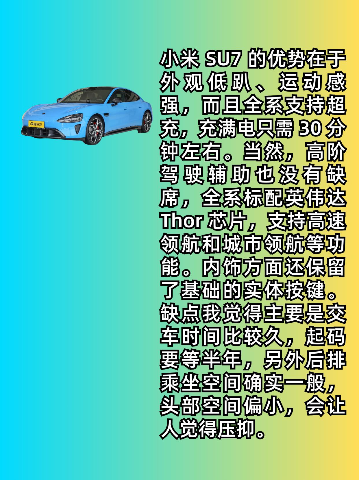 20 到 30 万元纯电轿车该怎么选? 相信很多小白都在纠结这个选车难题。其实这个价位可选的车型还真不少,比如小米 SU7、极氪 007 GT 和小鹏 P7。 今天我们就来好好分析一下,这几款车到底怎么选才更适合你! 小米 SU7 的优势在于外观低趴、运动感强,而且全系支持超充,充满电只需 30 分钟左右。当然,高阶驾驶辅助也没有缺席,全系标配英伟达 Thor 芯片,支持高速领航和城市领航等功能。内饰方面还保留了基础的实体按键。缺点我觉得主要是交车时间比较久,起码要等半年,另外后排乘坐空间确实一般,头部空间偏小,会让人觉得压抑。 极氪 007 GT 我觉得是一款很全面的车,采用了猎装轿跑 / 旅行车的设计,后排和后备箱空间都更大,而且底盘高度相对更高,上下地库不用担心刮到底盘。 小鹏 P7 的优点和缺点和小米 SU7 差不多,外观个性、运动,但审美比较挑人,喜欢的会很喜欢,不喜欢的就完全接受不了。而且它的后排乘坐空间比小米 SU7 还要小,底盘离地间隙也很低,虽然配备了空气悬挂,但通过性依然一般。【来自懂车帝车友圈】