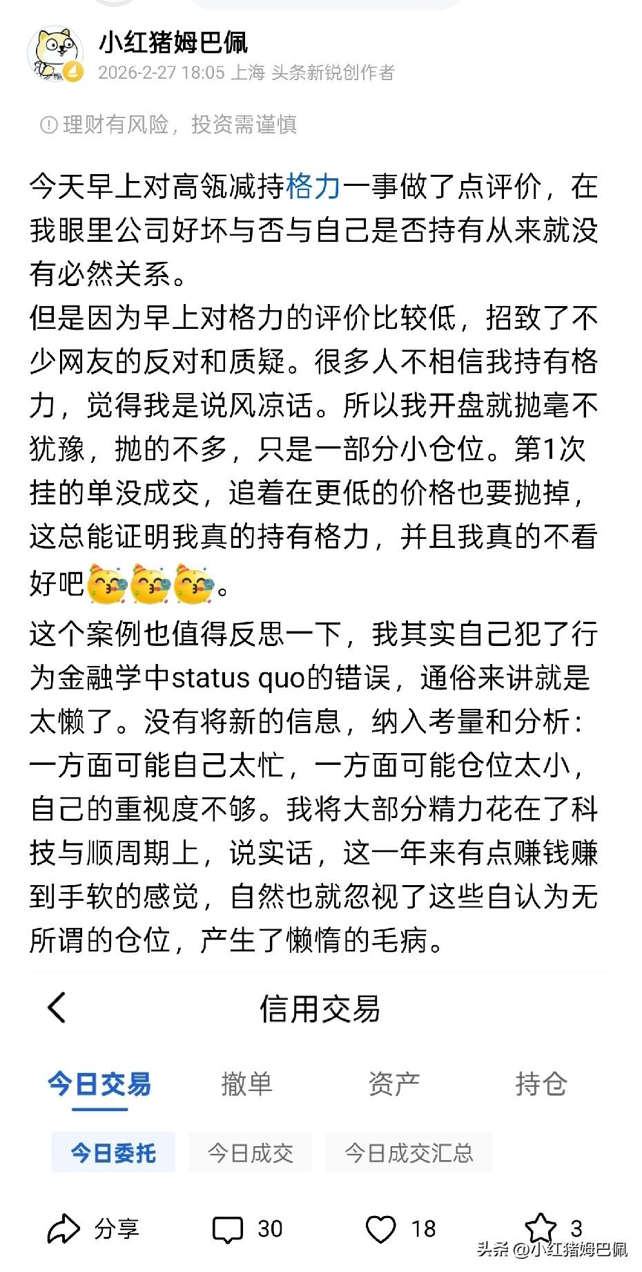 上周谈了一下高瓴减持格力的看法,因为看法是支持减持的,对格力偏负面,考虑到照顾持有格力并看好的朋友的情绪,我特意说了我也持有格力。当然,依然有人喷依然有人不信我持有。 所以,从点评后我就反思了一下自己对格力的态度,其实去年10月就不看好了。我也说了自己还是懒了,其他科技赚钱太多想着格力丢着就丢着没怎么管,就当收股息了。在写完点评后我自己深刻反省了这点,同时为了和这些朋友证明我有格力,我立刻作出了抛售格力的决定,并且逐步付诸于事实! 有人会觉得格力似乎调整那么久了,是不是相对底部,估值又高股息又不低。其实我看公司都是看未来的,我有能力看到行业明显业绩更景气的公司和机会,我为啥要懒得抛售前景不乐观的企业呢?! 所以,抛了格力,我几乎都转向了化工,没错!就是化工! 普通朋友不建议完全效仿我,因为背后有许多年的积淀和付出,你们没把握依然可以守住格力这样的价值股。有人鄙视说我们是投机赌博,其实每个决策背后大量的调研,对宏观经济和各个产业的熟悉,以及每天大量的阅读才得出的结论,并且完全基于基本面的投资。比这些人更称得上是价值投资吧!