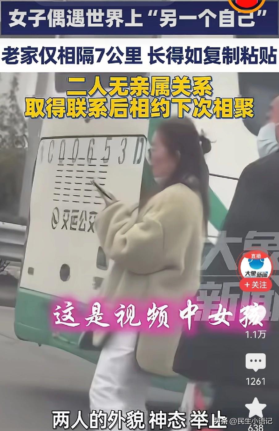 你敢相信吗?这世界上真的有长得一模一样的人。 近日,河南洛阳的董女士,在街头偶然邂逅了一位陌生女孩,四目相对的瞬间,连她自己都愣住了。两人的五官轮廓、神情气质,甚至不经意间的小动作,都高度重合,身边的家人朋友看到两人的对比照片,纷纷表示根本分不清谁是谁,直呼太不可思议。 因为当时匆忙,两人并未留下彼此的联系方式,念念不忘的董女士选择通过直播的方式寻人,仅仅三天,这位和她“撞脸”的女孩就被找到了。 深入交流后,更神奇的细节接踵而至:两人的老家仅仅相距7.7公里,平日里还经常逛同一个集市,生活轨迹有着莫名的交集,可最让人惊叹的是,两人完全没有任何血缘关系。 据悉,这位女孩目前在新加坡攻读博士学位,相隔千里的两人,已经定下了半年后回国相聚的约定,这份从天而降的奇妙缘分,即将迎来线下的重逢。 此事一经传播,瞬间引发网友热议,大家纷纷感慨:这哪里是普通的偶遇,分明是平行时空里的另一个自己,意外撞进了现实生活!这份概率极低的相遇,堪称现实版的“世界上的另一个我”。 大千世界,无奇不有,这种毫无血缘却容貌高度相似的“撞脸”缘分,浪漫又神奇。那么,在你的身边,有没有遇到过这样不可思议的神奇瞬间?有没有见过毫无关系却长得一模一样的人? (图片来自网络视频)