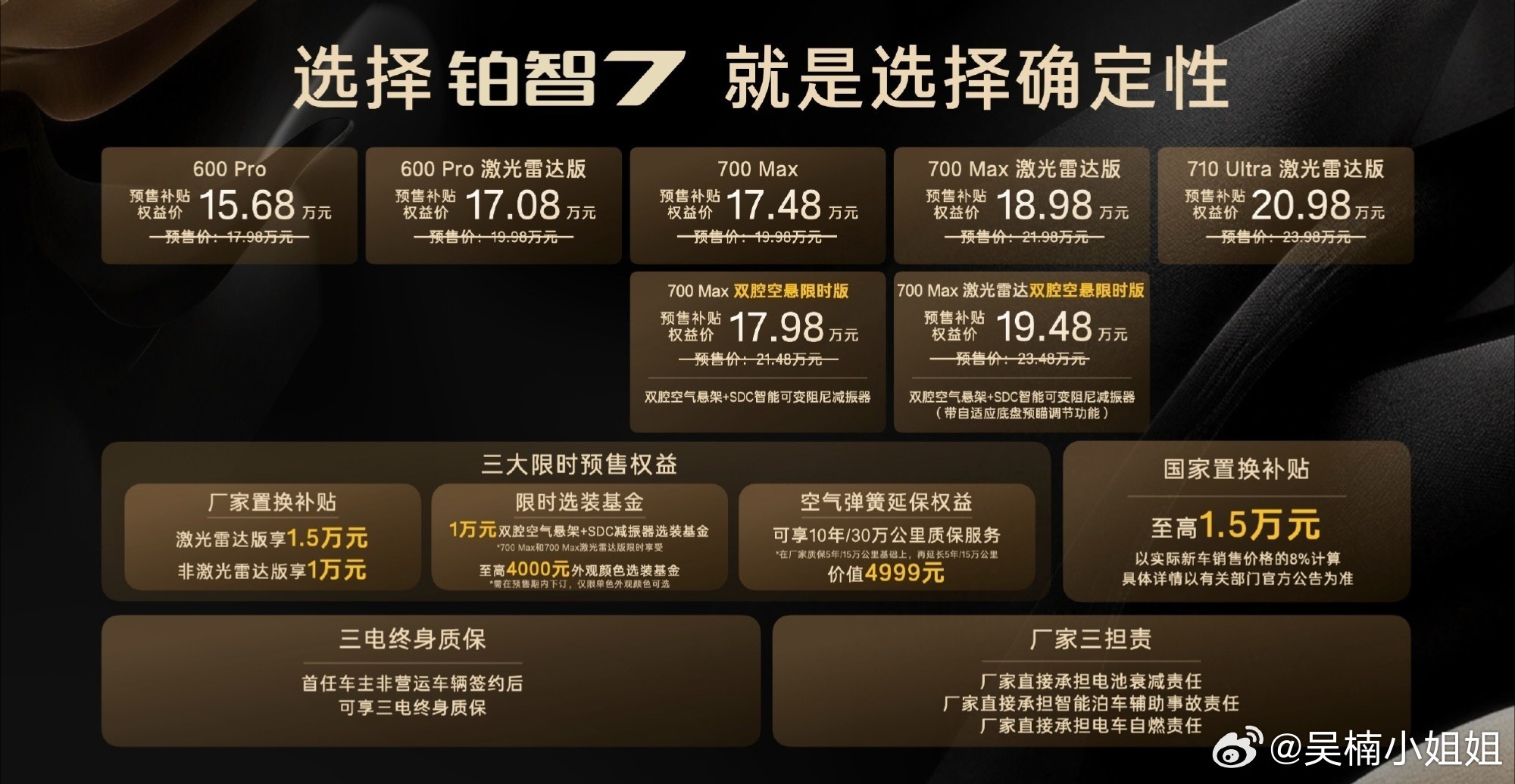丰田铂智7预售权益价15万起丰田这回是真下本了,铂智7用到了华为电机,激光雷达Momenta驾驶辅助,双腔空悬……延续了丰田一贯的靠谱。预售价15.98万起,现在就好奇,正式售价还会再低了吗?丰田铂智7预售限时三大权益