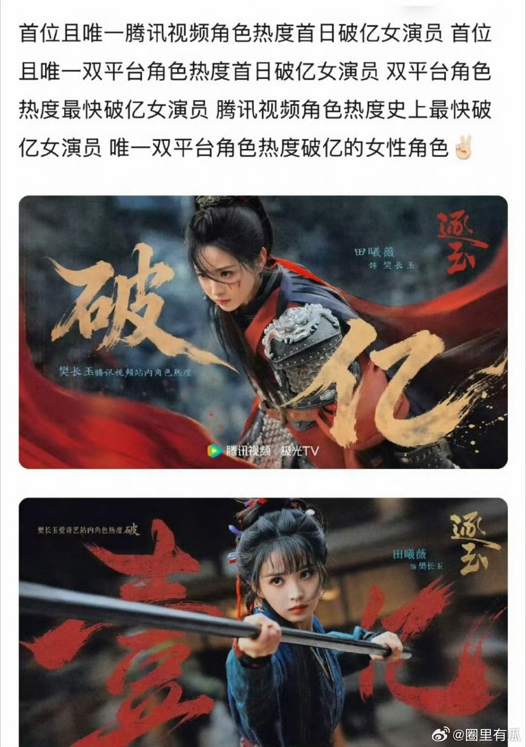 恭喜田曦薇成为首位且唯一双平台角色热度首日破亿女演员