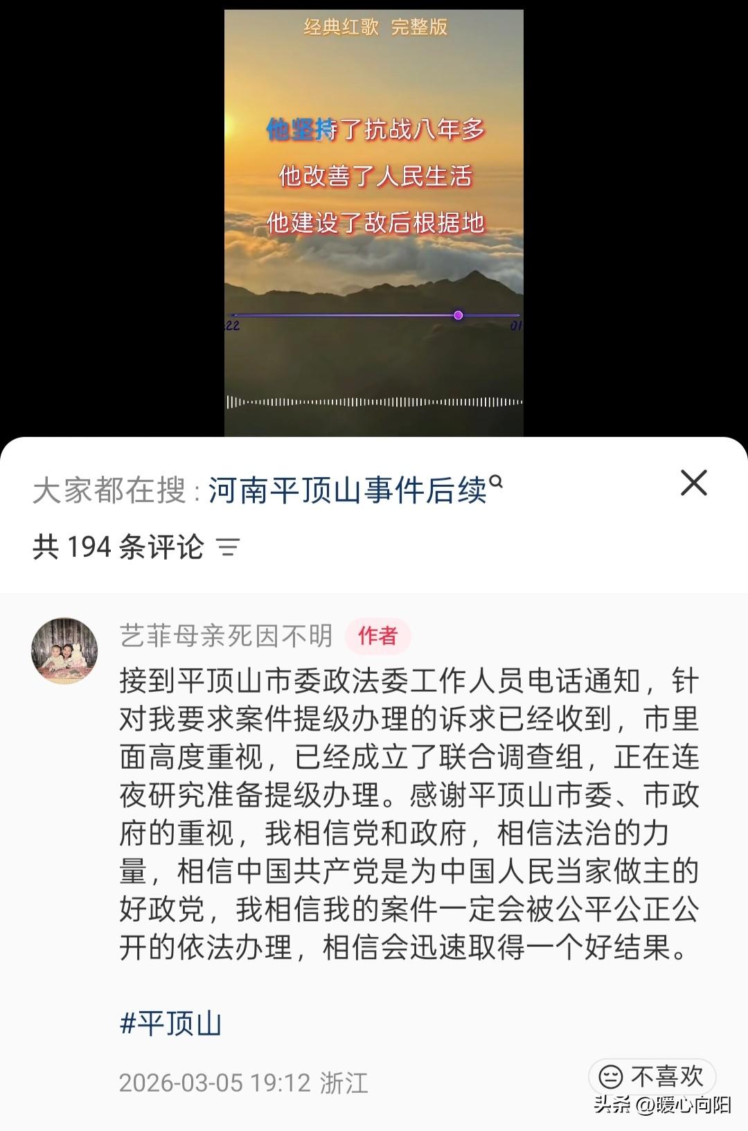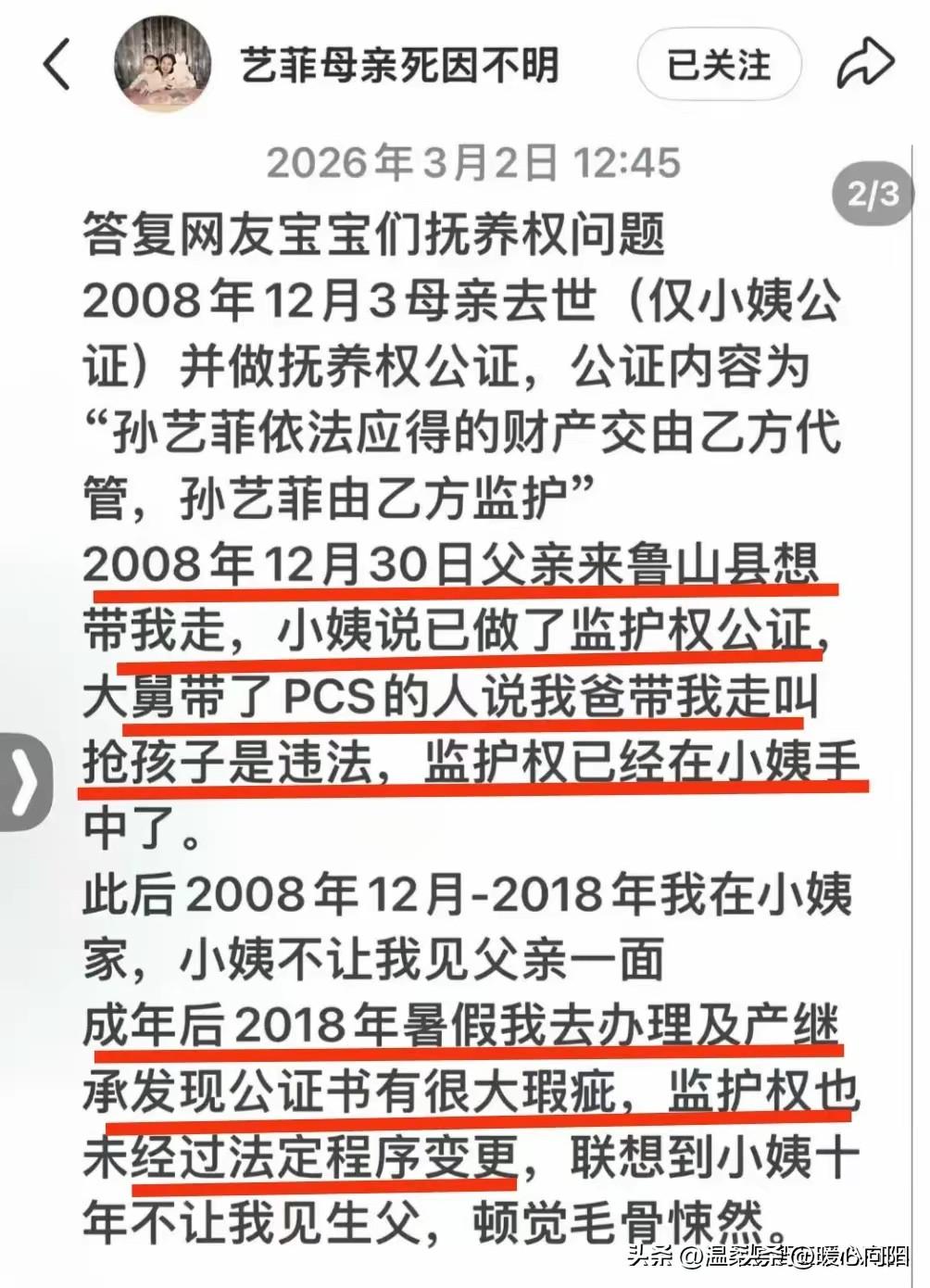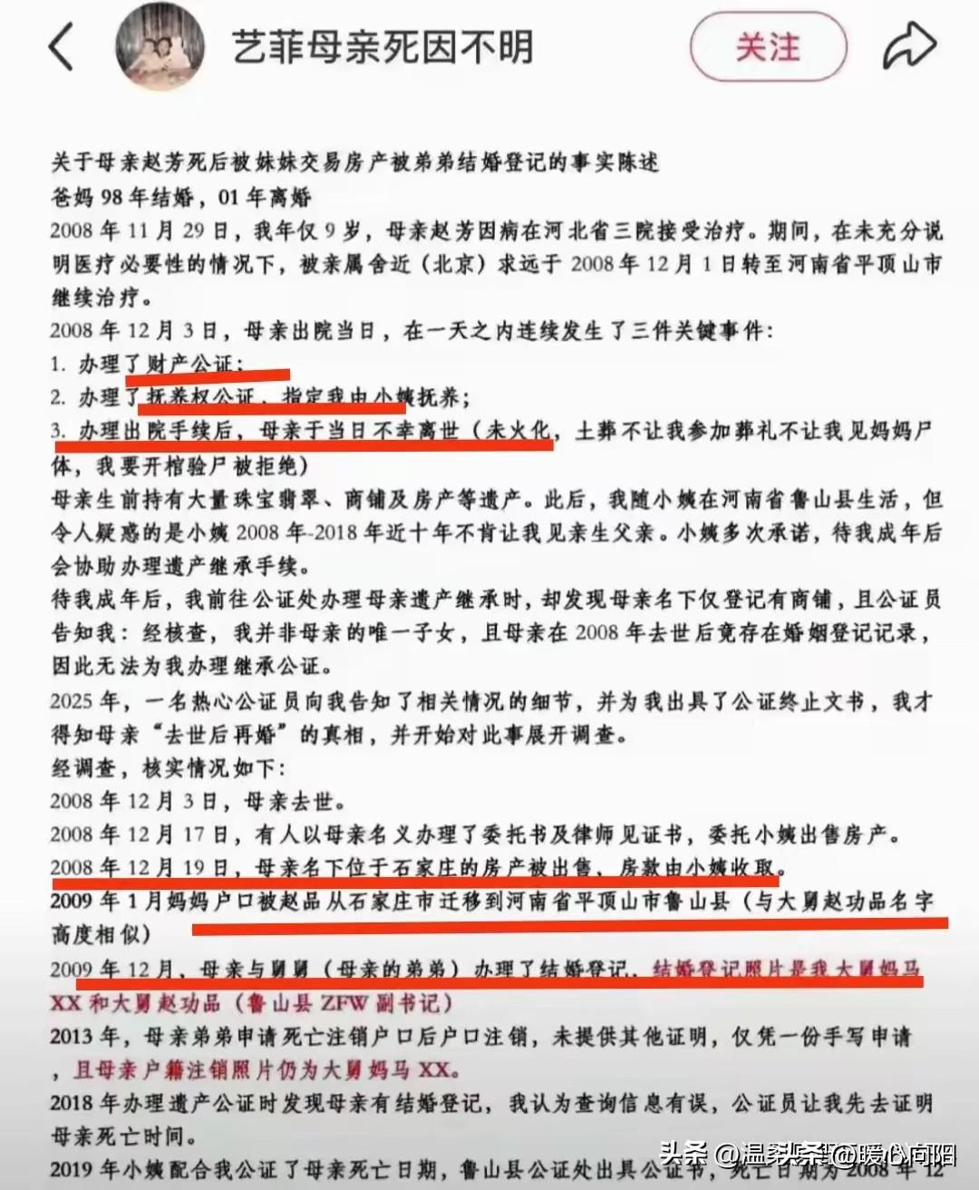 河南平顶山市鲁山县“母亲身份被舅妈冒用,亲舅舅成为继夫”事件有了新进展,女孩孙艺菲接到了官方电话通知! 3月5日晚上,女孩接到了平顶山市政法委工作人员的电话通知,针对女孩要求案件提级办理的诉求已经收到,市里面高度重视,正在连夜研究准备提级办理。 据女孩孙艺菲回忆,2008年11月29日,女孩9岁时母亲赵芳因病在河北省三院接受治疗,2008年12月1日被舅舅小姨舍近(北京)求远转到河南省平顶山市继续治疗。 2008年12月3日办理了出院手续,母亲出院当天发生了三件大事。 第一,办理了财产公证。 笫二,办理了抚养权公证,女孩由小姨抚养。 第三:母亲出院当天不幸死亡! 更让女孩难受的是不让她见母亲,也不让她参加葬礼。她要开棺验尸也被拒绝了。 孙艺菲说母亲去逝后,父亲来鲁山想接走她,也被舅舅小姨拒绝了。说父亲如果执意要带走她,那就是抢孩子是违法的。 母亲生前持有大量珠宝翡翠,商铺及房产等遗产。此后,我随小姨在河南省鲁山县生活。 但最让人想不通的是,小姨2008年-2018年近十年不肯让女孩见亲生父亲。小姨多次承诺,待女孩成年后会协助办理遗产继承手续。 2018年暑假。19岁的孙艺菲去办理母亲遗产继承时,工作人员告诉她,她母亲再婚后,还有其他孩子,不能为她办理。 孙艺菲一下子蒙了,明明母亲去逝了,就她一个孩子,怎么还有再婚,还有其他孩子。 最后经调查发现,2008年12月3母亲去逝。 2008年12月17日,有人以母亲名义办理了委托书及律师见证书,委托小姨出售房产。仅两天时间,母亲名下位于石家庄的房产被出售,房款由小姨收取。 2009年母亲的户口从石家庄迁入河南鲁山县,同年母亲又再婚,再婚对象是舅舅。 舅妈冒用母亲的身份证与舅舅结婚。并且生下了孩子。所以遗产继承不能办理。 母亲生前有大量珠宝翡翠,商铺和房产。舅舅小姨弄虚作假,做伪证,侵吞了母亲大量遗产。 最让意想不到的是舅舅伙同舅妈冒用母亲的身份结婚,为了钱财,能做出这种荒唐的事,真是天下一大奇闻。 孙艺菲9岁失去母亲,舅舅小姨本是她最亲近的人,也是最相信的人。没想到他们为了钱财把亲情良心全抛在脑后,弄虚作假侵吞了母亲大量遗产,难道就没有良心的谴责! 现在,这件己全部调查清楚了,平顶山市政法委高度重视,一定会有好结果的,还给女孩个公道。