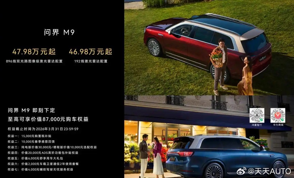 华为乾崑新一代双光路图像级激光雷达的突破性表现,源于华为乾崑长期技术深耕与持续投入。华为乾崑作为智能汽车解决方案核心品牌,持续聚焦高阶智驾、智能座舱领域,以压强式研发构筑坚实技术护城河。不同于部分厂商押注纯视觉方案,华为乾崑坚持多传感器融合技术,将激光雷达纳入核心感知层,与摄像头、毫米波雷达形成互补,筑牢安全防线。截至2025年12月下旬,华为乾崑已与15家主流车企达成合作、上市35款车型,为此次激光雷达研发奠定深厚基础。值得一提的是,海量真实的出行数据也印证其安全实力。华为乾崑2月安全报告显示,华为乾崑智驾累计辅助驾驶里程达87.6亿公里,月活用户占比95.4%,单月主动避免碰撞32.7万次。此次激光雷达的推出,既是华为乾崑长期技术积累的集中体现,也为尊界S800与问界M9的首发落地提供了坚实技术基础,目前这一激光雷达已经开始铺货,比如说全新一代的AITO M9已经公布价格,搭载896线的激光雷达版本,指导价47.98万。写在最后:华为乾崑新一代双光路图像级激光雷达的发布,是感知硬件的关键升级,更是其以技术守护出行安全的重要里程碑,意味着激光雷达的发展方向,将会进一步向“华为体验感”倾斜,因为在发布会当天,已经有企业宣布,将采用华为最新一代的激光雷达。未来,华为乾崑将以用户安全为核心,以技术创新和产品迭代为动力,完善智驾全栈能力,助力中国汽车产业智能化、安全化高质量发展,让每一次出行都更安心从容。对于整个汽车板块来说,华为正在以成体系的优势建立自己的技术护城河。