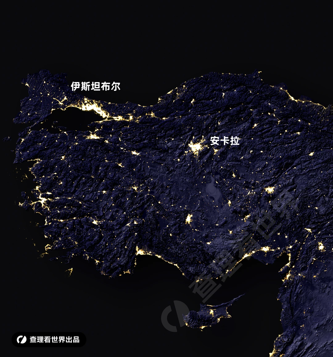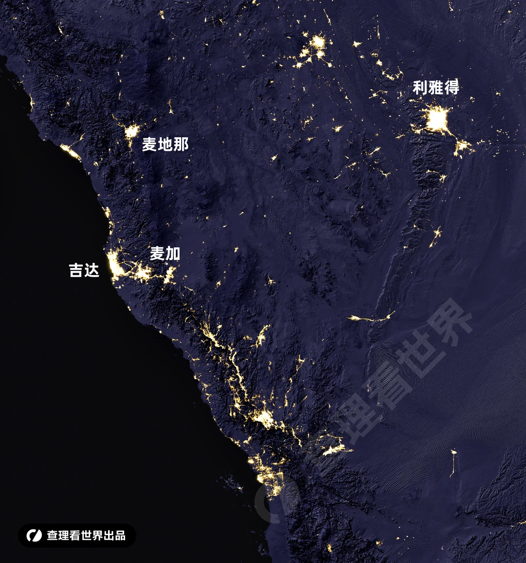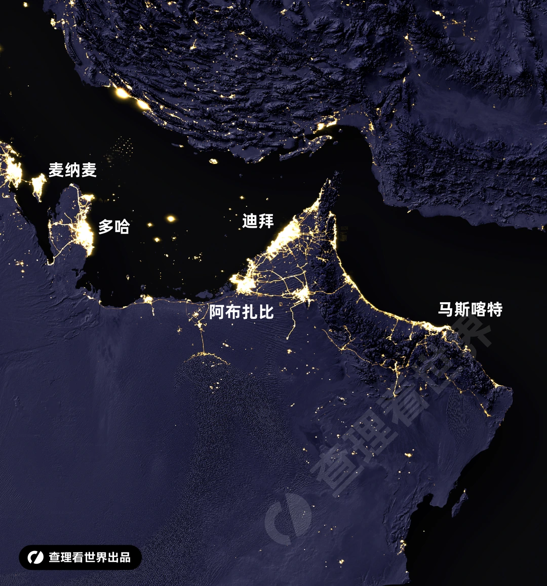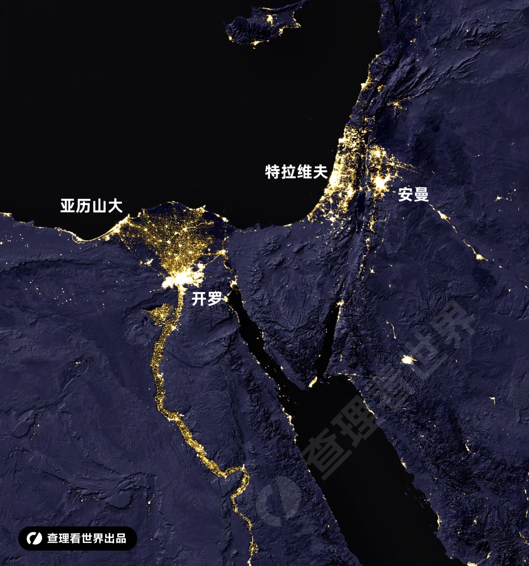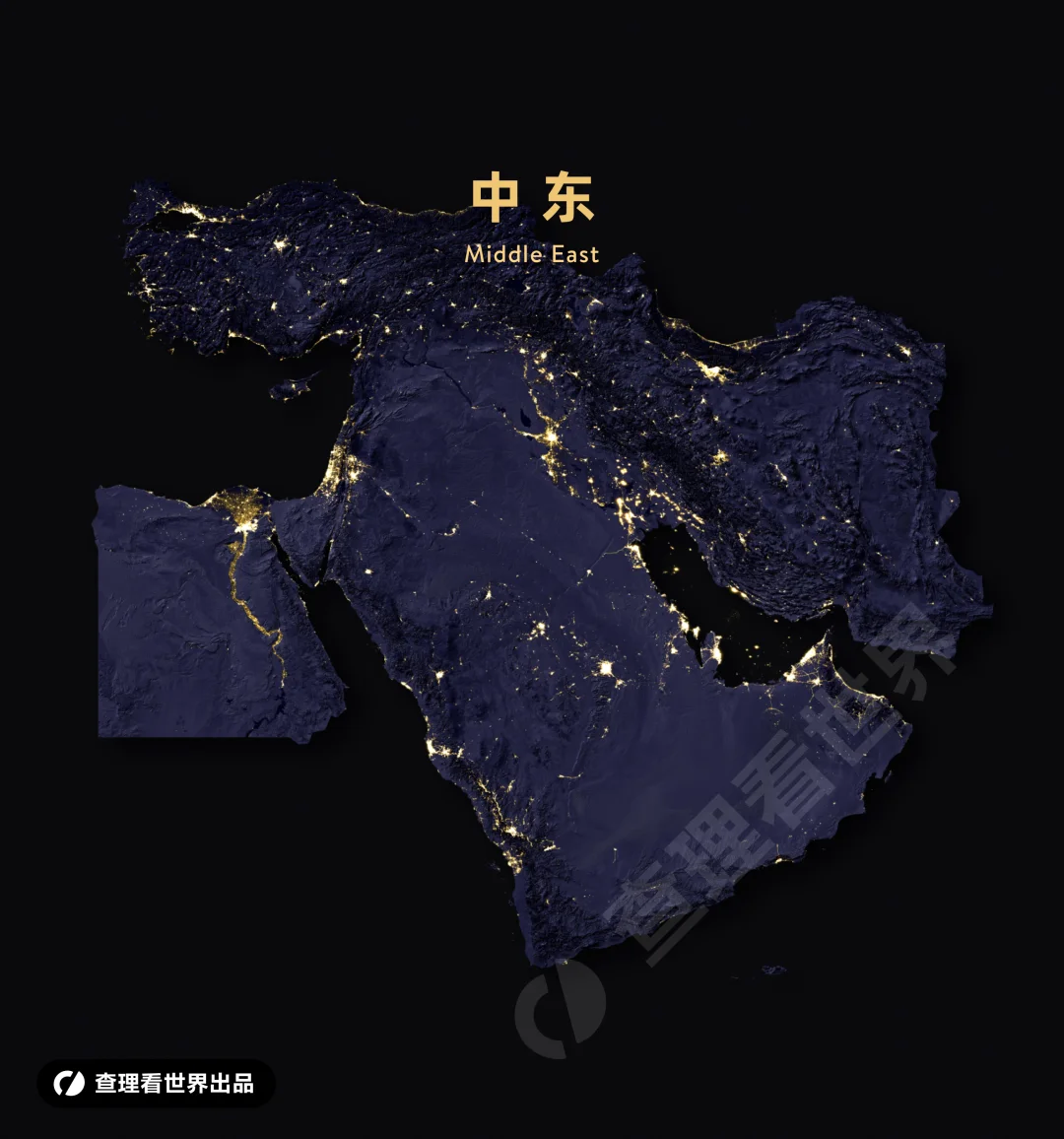 这张中东夜景灯光地图,清晰勾勒出中东地区的人口与文明脉络。 尼罗河谷地的金色光带,是古埃及文明的延续;波斯湾沿岸的璀璨光斑,是石油财富与城市崛起的注脚;而广袤的阿拉伯沙漠,则在黑暗中沉默,凸显出 “逐水而居” 的生存法则。 灯光的分布,深刻反映了中东的地理与经济逻辑:水源决定了人口的基底,石油重塑了城市的格局。两河流域、地中海沿岸与波斯湾沿岸,既是历史上的文明摇篮,也是当代人口与财富的核心区。而那些黑暗的荒漠,既是自然的边界,也是发展的鸿沟。