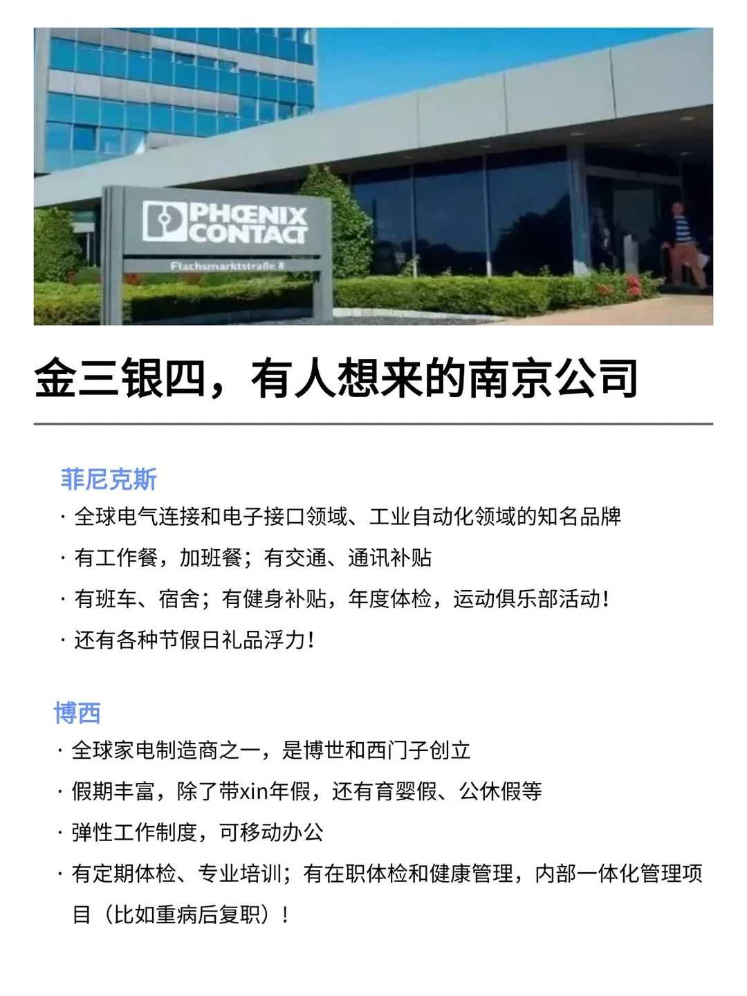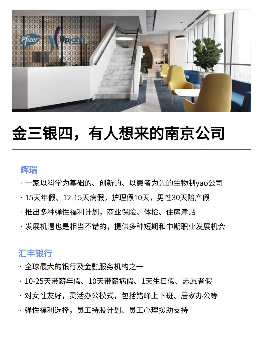 南京发展真的越来越好,有不少小而美、冷门宝藏的公司,金三银四是真的很多的机会! 特别是有不少小众冷门的外企,真心建议大家可以去试试 · 大家不要觉得外企很难进 其实外企也有一些常规类、英语要求没有那么高的岗位 · 为什么还是值得去外企? ▪️氛围好,对女性友好,年假长,平均年假都是15天 ▪️还支持居家办公、福利完善,是真的能实现WLB ▪️待遇也还不错,年后找工作的真的可以考虑考虑~ · 坚持日更,帮大家在找工作路上顺利拿 offer! ·