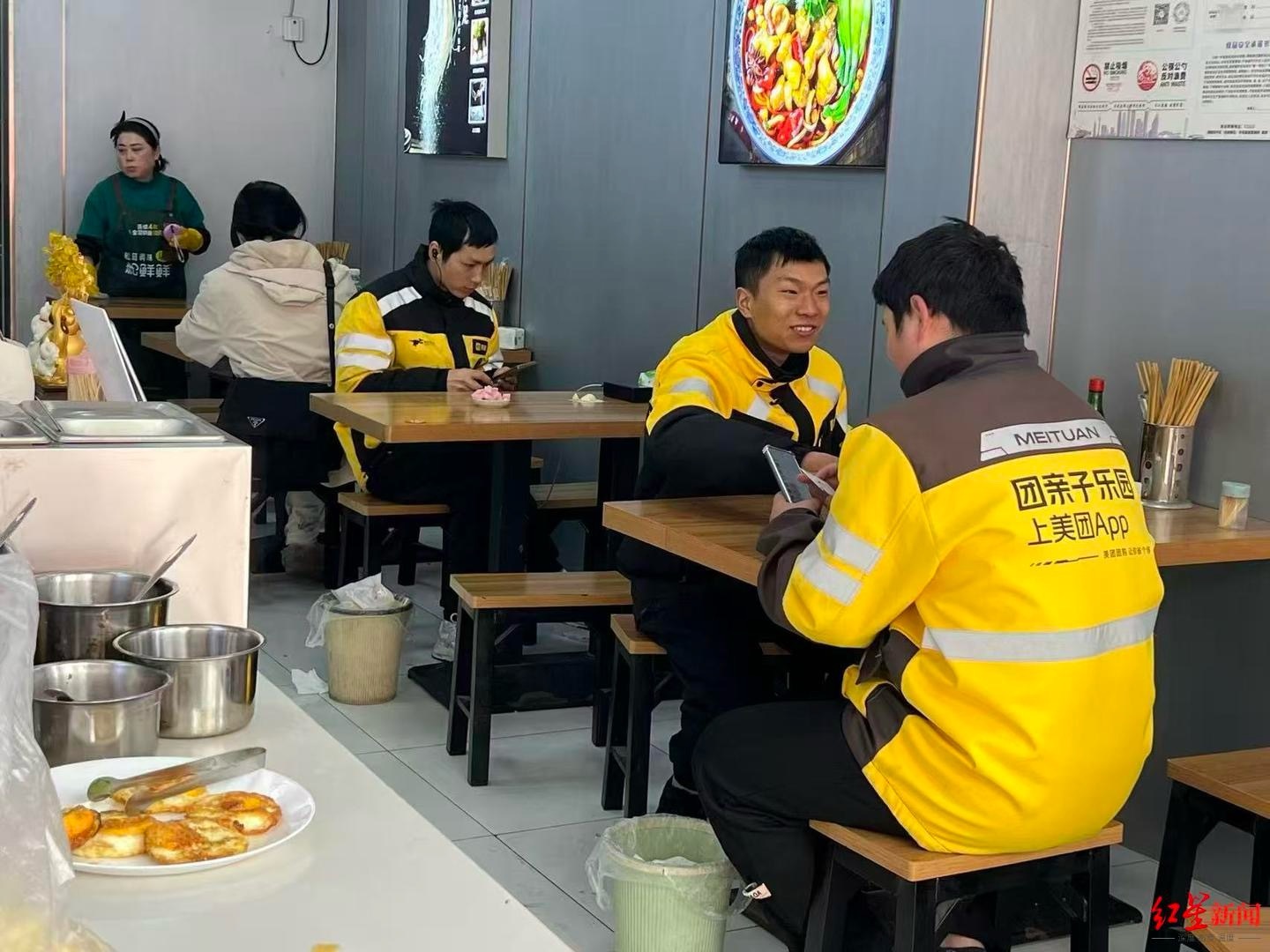 在他的手机里,加了不少外卖骑手的微信,还有一个200多人的“8号素椒面”微信群。大家习惯了在这里吃面、叫面,这家从早到晚营业的面馆也成为周围外卖骑手休息歇脚的地方。