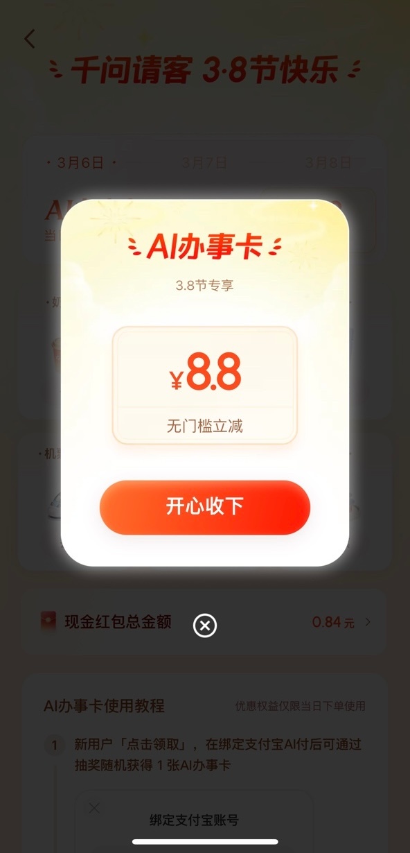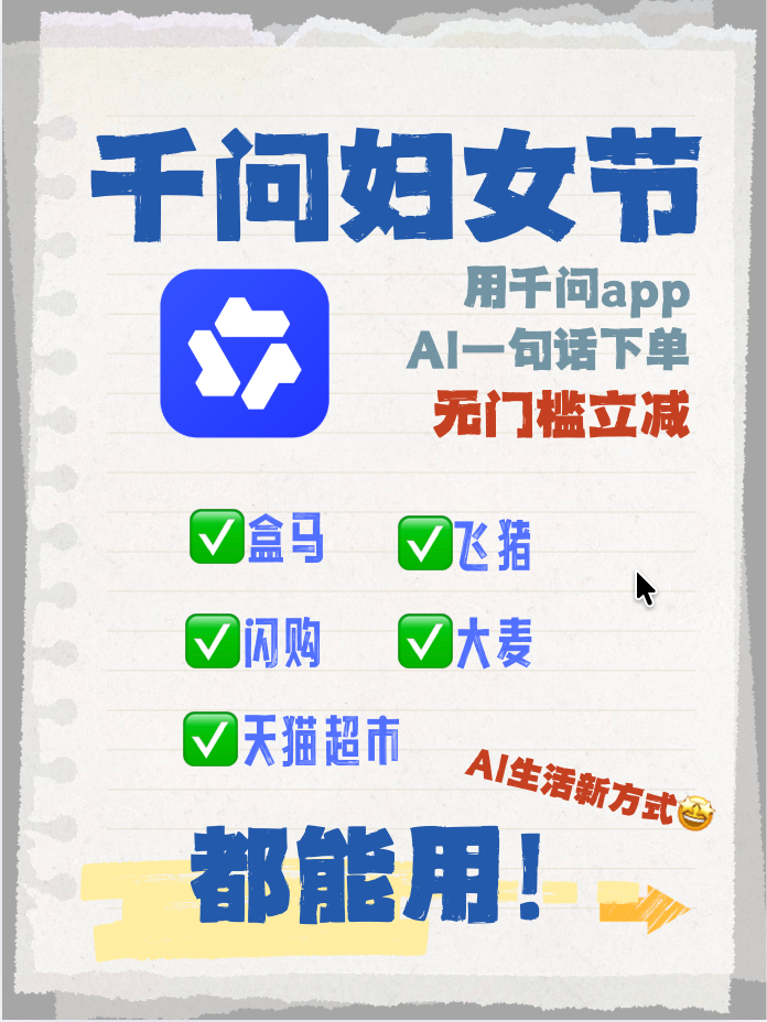 千问三八节AI下单无门槛立减 开年立的flag不能倒:今年夏天必须练出线条,健身器材赶紧安排上。我看到现在用千问APP,AI一句话就可以直接下单,还有无门槛立减,划算又便捷!所以美美购入了瑜伽垫和跳绳!千问帮我办事还帮我省钱,好用爱用,AI的便利真的开始改变了我的生活方式!千问妇女节活动千问