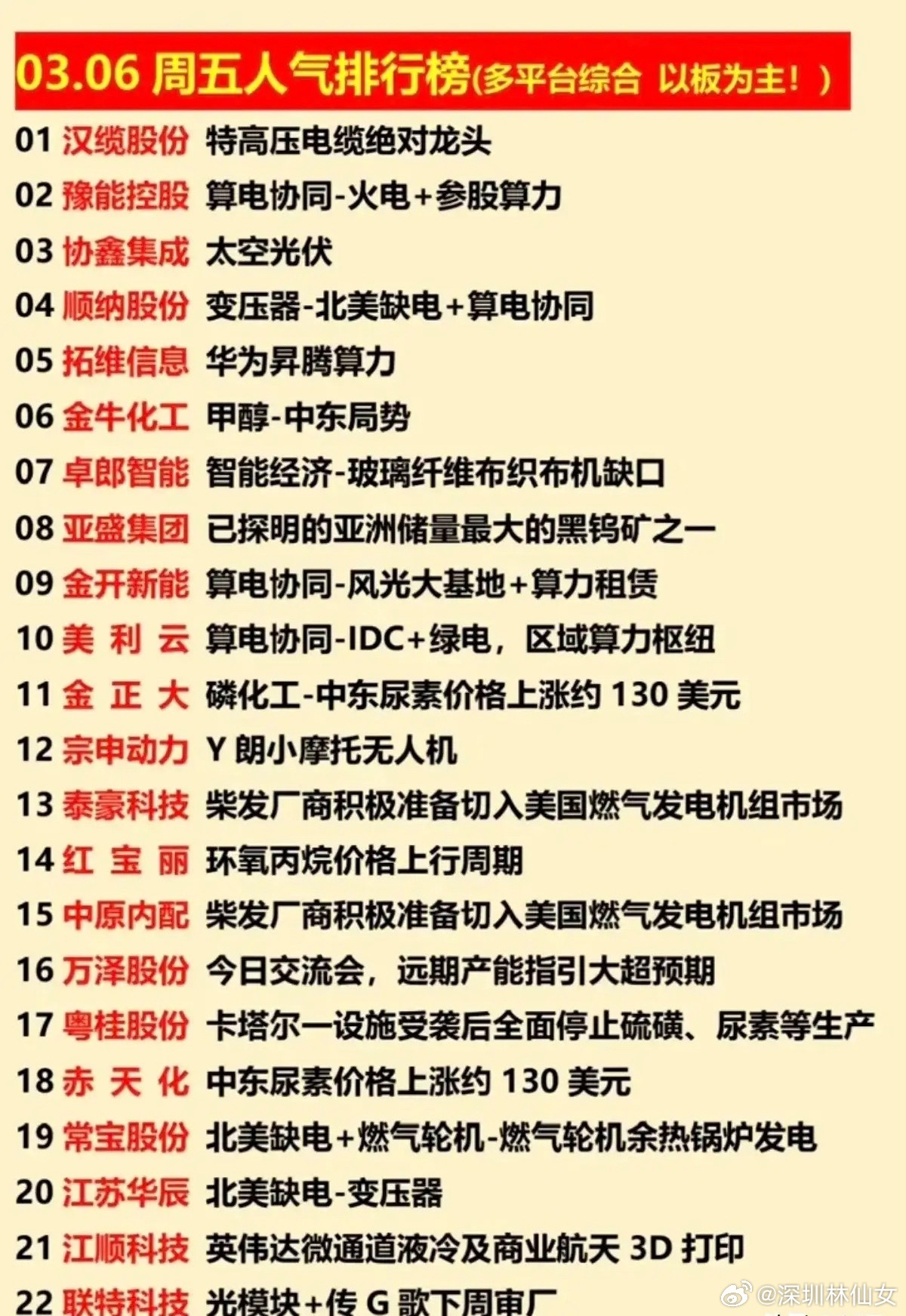 个股梳理分析1. 汉缆股份,位列人气榜第1位,是国内特高压电缆绝对龙头,深耕高压超高压电缆领域,为电网建设核心受益标的,凭借行业龙头地位登顶人气榜首。2. 豫能控股,位列人气榜第2位,核心逻辑为算电协同,主营火电业务同时参股算力赛道,是当下市场热门的算电协同核心标的,市场人气居前。3. 协鑫集成,位列人气榜第3位,绑定太空光伏热门赛道,深耕光伏全产业链,是TOPCon电池龙头,此前获主力大额净流入,市场人气高涨。4. 顺纳股份,位列人气榜第4位,核心逻辑为变压器+北美缺电+算电协同,受益于北美缺电带来的变压器需求提升,叠加算电协同概念,人气居前。5. 拓维信息,位列人气榜第5位,是华为昇腾算力核心合作伙伴,深度绑定华为算力生态,此前获主力超13亿净流入,是算力赛道人气龙头。6. 金牛化工,位列人气榜第6位,主营甲醇等化工产品,受益于中东局势带来的化工品价格波动,叠加此前涨停表现,成为化工板块人气标的。7. 卓郎智能,位列人气榜第7位,核心逻辑为智能经济,叠加玻璃纤维布织布机缺口的市场预期,是智能制造赛道的热门人气标的。8. 亚盛集团,位列人气榜第8位,拥有已探明的亚洲储量最大的黑钨矿之一,是小金属钨赛道核心标的,凭借稀缺资源属性获得高人气。9. 金开新能,位列人气榜第9位,核心逻辑为算电协同,主营风光大基地新能源运营,同时布局算力租赁业务,是绿电+算力的热门标的。10. 美利云,位列人气榜第10位,核心逻辑为算电协同,拥有IDC数据中心业务,叠加绿电属性,是区域算力枢纽核心标的,市场人气较高。11. 金正大,位列人气榜第11位,主营磷化工、尿素等农资产品,受益于中东尿素价格上涨约130美元的催化,成为化工板块热门人气标的。12. 宗申动力,位列人气榜第12位,核心绑定伊朗小摩托无人机概念,是低空经济赛道核心配套企业,此前获主力超12亿净流入,人气高涨。13. 泰豪科技,位列人气榜第13位,是国内柴发核心厂商,正积极准备切入美国燃气发电机组市场,受益于北美缺电催化,市场人气居前。14. 红宝丽,位列人气榜第14位,主营环氧丙烷、聚氨酯新材料,当前处于环氧丙烷价格上行周期,产品涨价带来业绩预期,获市场高人气。15. 中原内配,位列人气榜第15位,是国内柴发相关核心厂商,正积极准备切入美国燃气发电机组市场,受益于北美缺电催化,市场人气较高。16. 万泽股份,位列人气榜第16位,当日召开交流会,释放的远期产能指引大超市场预期,带来业绩增长想象空间,获市场资金高度关注。17. 粤桂股份,位列人气榜第17位,受益于卡塔尔设施受袭后硫磺、尿素停产带来的产品涨价预期,是化工板块的热门人气标的。18. 赤天化,位列人气榜第18位,主营尿素等农资化工产品,受益于中东尿素价格上涨约130美元的催化,产品涨价带来业绩弹性,人气居前。19. 常宝股份,位列人气榜第19位,核心逻辑为北美缺电+燃气轮机,主营燃气轮机余热锅炉发电相关产品,受益于北美缺电需求提升,人气较高。20. 江苏华辰,位列人气榜第20位,核心逻辑为北美缺电+变压器,主营变压器相关产品,受益于北美缺电带来的海外需求提升,获市场高人气。21. 江顺科技,位列人气榜第21位,核心绑定英伟达微通道液冷热门赛道,同时叠加商业航天3D打印概念,覆盖两大热门赛道,人气高涨。22. 联特科技,位列人气榜第22位,是全球高速光模块核心厂商,叠加传谷歌下周审厂的催化,此前获主力大额净流入,是光模块赛道人气龙头。总结今日A股市场的核心炒作主线与资金偏好,算电协同是当日市场最核心的人气主线,相关标的批量上榜,成为资金共识最强的方向;事件驱动类题材表现亮眼,中东局势带来的化工品涨价、北美缺电带来的出海需求提升,成为两大核心催化,带动相关标的集中冲高;同时华为算力、太空光伏、低空经济、光模块等前期热门赛道的龙头标的依旧维持高人气,市场热点围绕“主线抱团+事件催化”双轮展开,上榜标的均具备清晰的炒作逻辑与资金关注度,是当日市场情绪的核心风向标。