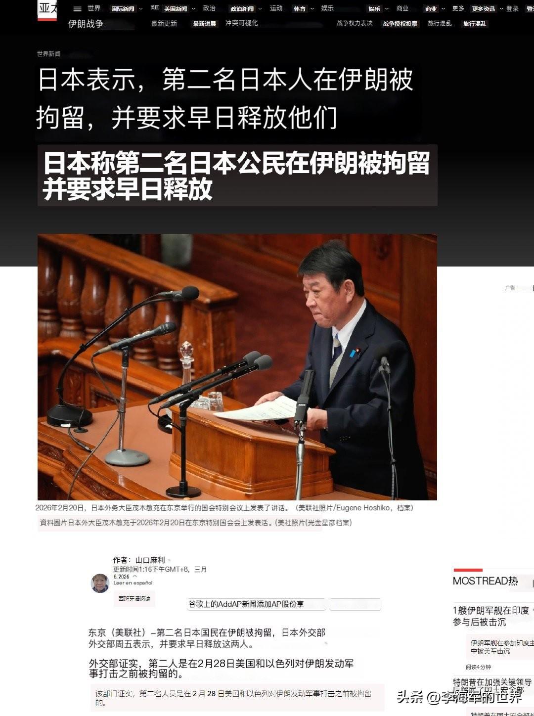 日本外务省宣称,又有一名日本公民在伊朗遭拘留,东京方面已要求尽早释放这两名公民。 据美联社消息,日本外务省证实,第二名人员是在 2 月 28 日美国和以色列对伊朗发动军事打击之前被拘留的。 伊朗有那么多外国人,为何不拘留其他国家的人,偏偏拘留日本人,而且一下就是两个? 我第一反应就是,这俩日本人是间谍。 日本干这种事又不是头一回,当年它还帮美军在波斯湾排过雷呢。 这两人肯定是在伊朗期间,在敏感地点偷偷拍照,被伊朗警方逮个正着。 要是正常去伊朗旅游或者定居,绝对不会被抓。 你看人家 CNN 记者在伊朗好好的,怎么就你们日本人在伊朗被抓了,自己做了什么心里没点数吗? 给日本提个建议,来个中东版的《我们走丢了一个士兵》。