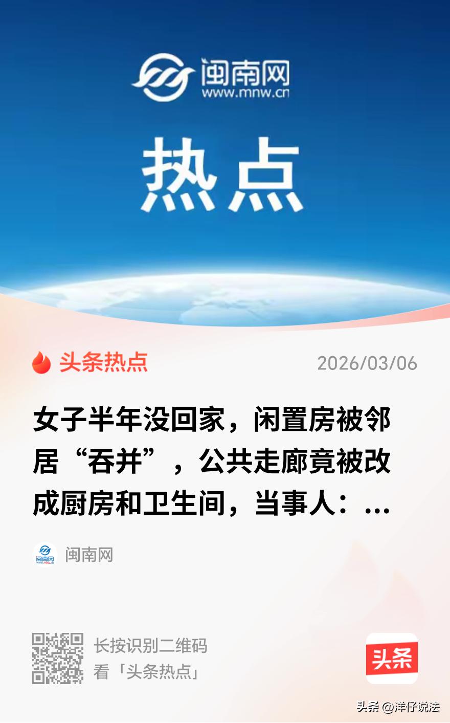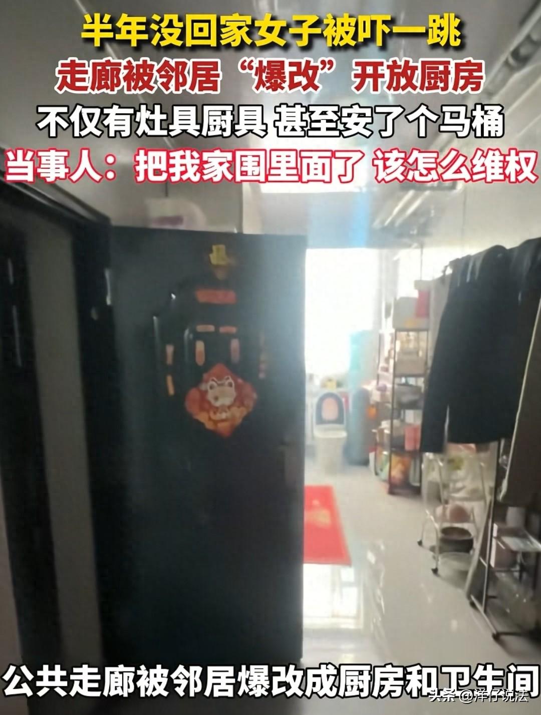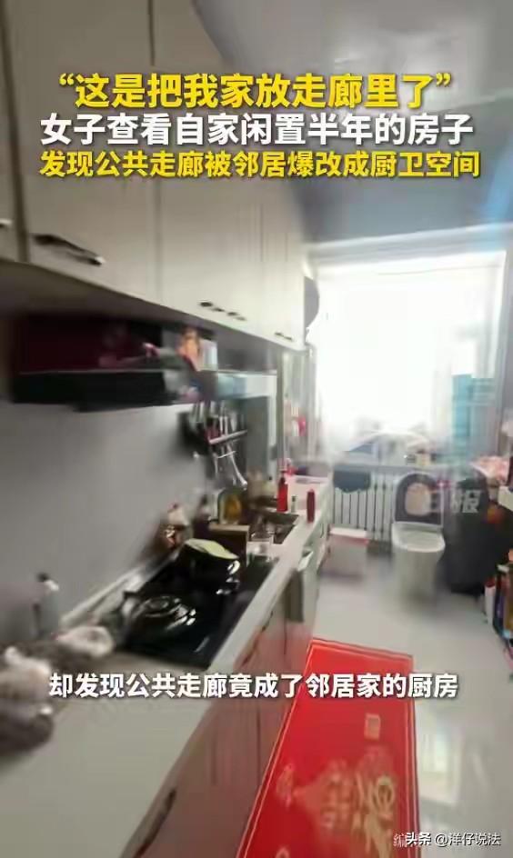 内蒙古,一女子半年后回到自己闲置的房子,推门一看,差点以为自己走错了单元,公共走廊完全变了样:燃气灶、洗手台、马桶一应俱全,水泥地铺了瓷砖,头顶装了吊顶,活脱脱一套开放式厨卫。更让她哭笑不得的是,邻居还“热心”地给她家旧门框包了边,顺手贴了副红彤彤的春联。半年没回家,公共走廊竟被邻居改造成了私家领域。   2026年3月4日晚上,徐女士像往常一样刷着手机,突然想起自己在市区那套老房子已经半年没去过了。   第二天正好有空,她决定去看看。这一看,差点让她以为自己走错了楼栋。   事情得从这套房子的位置说起。徐女士的这套房子位于一栋有些年头的老公寓楼里,每层有好几户人家,住户们共用一条公共走廊,走廊连接着楼梯和各家各户的大门。   徐女士平时不住这儿,这套房子一直空着,偶尔想起来才会过去看看。   3月5日这天,她推开楼道的大门,爬上楼梯,走到自己所在的那一层,眼前的景象让她愣住了。   走廊变了。   她清楚地记得,半年前离开的时候,这条走廊还是老样子,水泥地面,灰扑扑的墙壁,头顶是裸露的管道和电线,偶尔有几盏昏暗的灯亮着。   可现在呢?脚下的水泥地不见了,取而代之的是崭新的瓷砖,光滑得能照出人影。   头顶上,原本裸露的管道被白色的吊顶遮得严严实实,装上了明亮的吸顶灯。墙壁也重新粉刷过,白得发亮。   她顺着走廊往自家门口走,越走越觉得不对劲。   走廊靠墙的一侧,竟然摆着一台燃气灶,灶台上放着炒锅和调料瓶,旁边的墙上挂着抽油烟机。   再往前走几步,一个白色的洗手台嵌在墙壁里,上面放着牙刷杯和洗面奶。   洗手台旁边,居然还摆着一台洗衣机,洗衣机的排水管直接插进了墙边的一个地漏里。   最让她目瞪口呆的是,洗手台的对面,隔着一道简易的塑料帘子,里面隐约能看到一个马桶。   燃气灶、洗手台、洗衣机、马桶……这哪还是公共走廊,分明是一套开放式的一居室啊。   徐女士愣在原地好一会儿,才反应过来:这是邻居把公共走廊给“吞并”了,改成了自己家的厨房和卫生间。   她继续往自家门口走,发现邻居不仅改造了走廊,还“顺手”给她家做了点装修,她家那扇老旧的防盗门,门框被包上了崭新的木线条,门上贴着一副红彤彤的春联,上联是“春风得意马蹄疾”,下联是“新年更上一层楼”,横批“万事如意”。   徐女士哭笑不得,她在自己的社交媒体账号上发了视频,配文写道:“闲置的房子今天回去看看吓我一跳,成别人家了……还挺热心的,给我贴了一副对联。”   视频很快引起了网友们的围观。   有人调侃说:“这邻居挺讲究啊,把公共区域装修得这么漂亮,还帮你家装修了门框,你应该感谢他。”   也有人替她担心:“这燃气灶就在走廊里,万一着火了整层楼都危险。”   更多的人则是好奇:邻居到底是怎么想的?物业不管吗?这事儿最后怎么解决?   徐女士后来找到邻居,要求他把走廊恢复原状。   邻居的态度倒是挺客气,没有否认自己的行为,也没有表现出不满,只是说“周末回来协商”。   网友们纷纷猜测:邻居会同意恢复原状吗?他会不会要求徐女士分担一部分装修费用?毕竟他也给徐女士家的门框做了“升级”,还贴了春联。   从法律的角度来看,这件事其实并不复杂。   公共走廊属于建筑物的共有部分,归全体业主共有,任何个人都不能私自占用或改造。   《民法典》第二百七十一条明确规定,业主对建筑物内的住宅、经营性用房等专有部分享有所有权,对专有部分以外的共有部分享有共有和共同管理的权利。   也就是说,走廊是大家的,不是某一户人家的。   本案中,邻居在走廊里安装燃气灶、洗手台、马桶等设施,属于擅自占用、改造共有部分的行为,侵犯了其他业主的共有权。   徐女士作为业主之一,有权要求邻居停止侵害、恢复原状。   此外,《民法典》第九百四十二条规定,物业服务人应当按照约定和物业的使用性质,……维护物业服务区域内的基本秩序,采取合理措施保护业主的人身、财产安全。   如果邻居拒绝,她可以向物业公司投诉,要求物业出面制止。   如果物业不管,她还可以向住建部门举报,或者直接向法院提起诉讼,要求邻居排除妨碍、恢复原状。   至于邻居给徐女士家贴的春联、包的门框,虽然看起来像是“帮忙”,但实际上也是一种未经同意的“装修”。   《民法典》第三百二十二条规定,因加工、附合、混合而产生的物的归属,……法律没有规定的,按照充分发挥物的效用以及保护无过错当事人的原则确定。因一方当事人的过错或者确定物的归属造成另一方当事人损害的,应当给予赔偿或者补偿。   如果徐女士不认可这种装修,同样可以要求邻居拆除。毕竟,这是她的家门,邻居没有权利替她做主。   如果相关装修无法拆除,则徐女士有权取得该等装修,但如有受益的,可以适当补偿对方。   对此,您怎么看?
