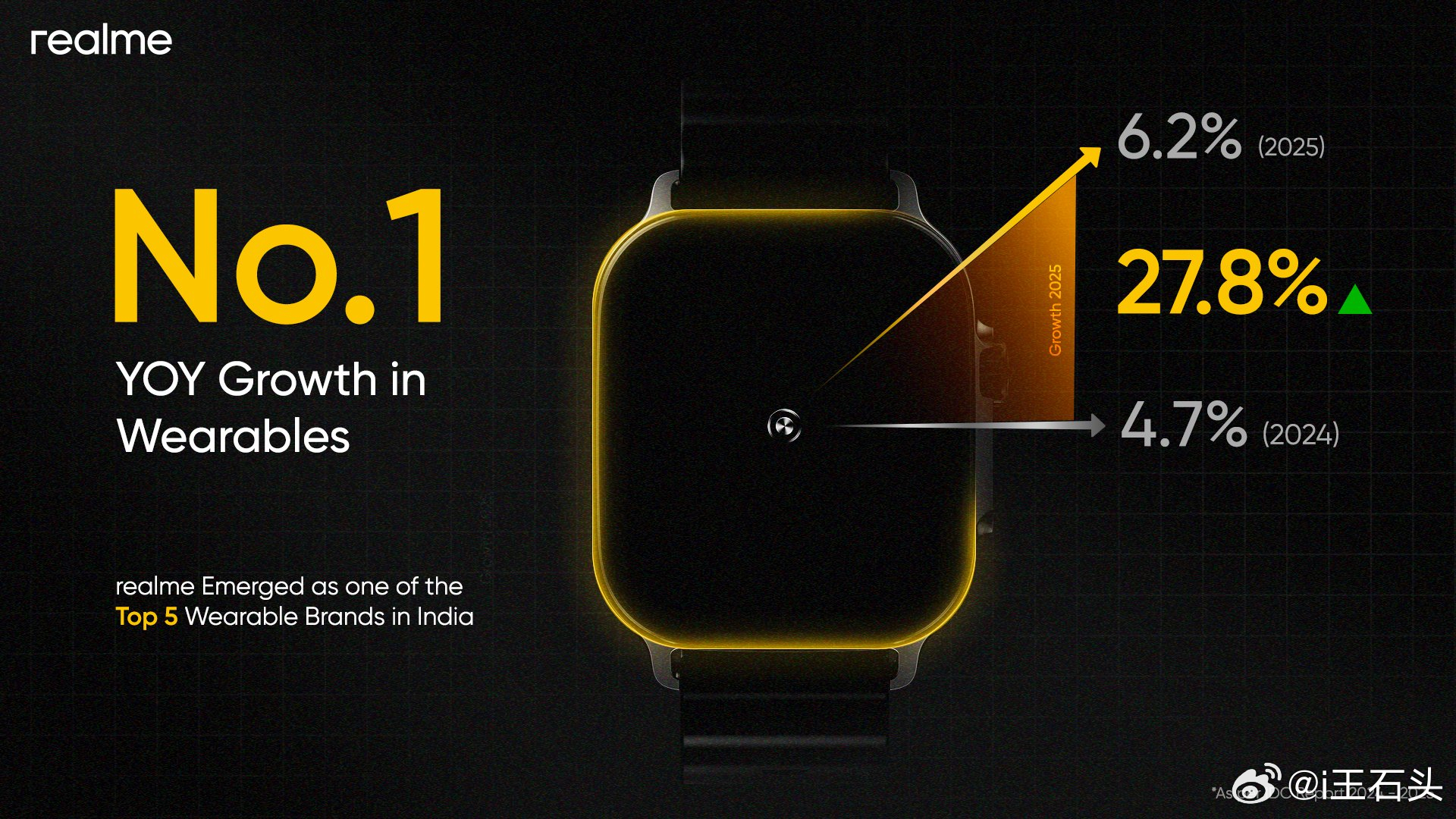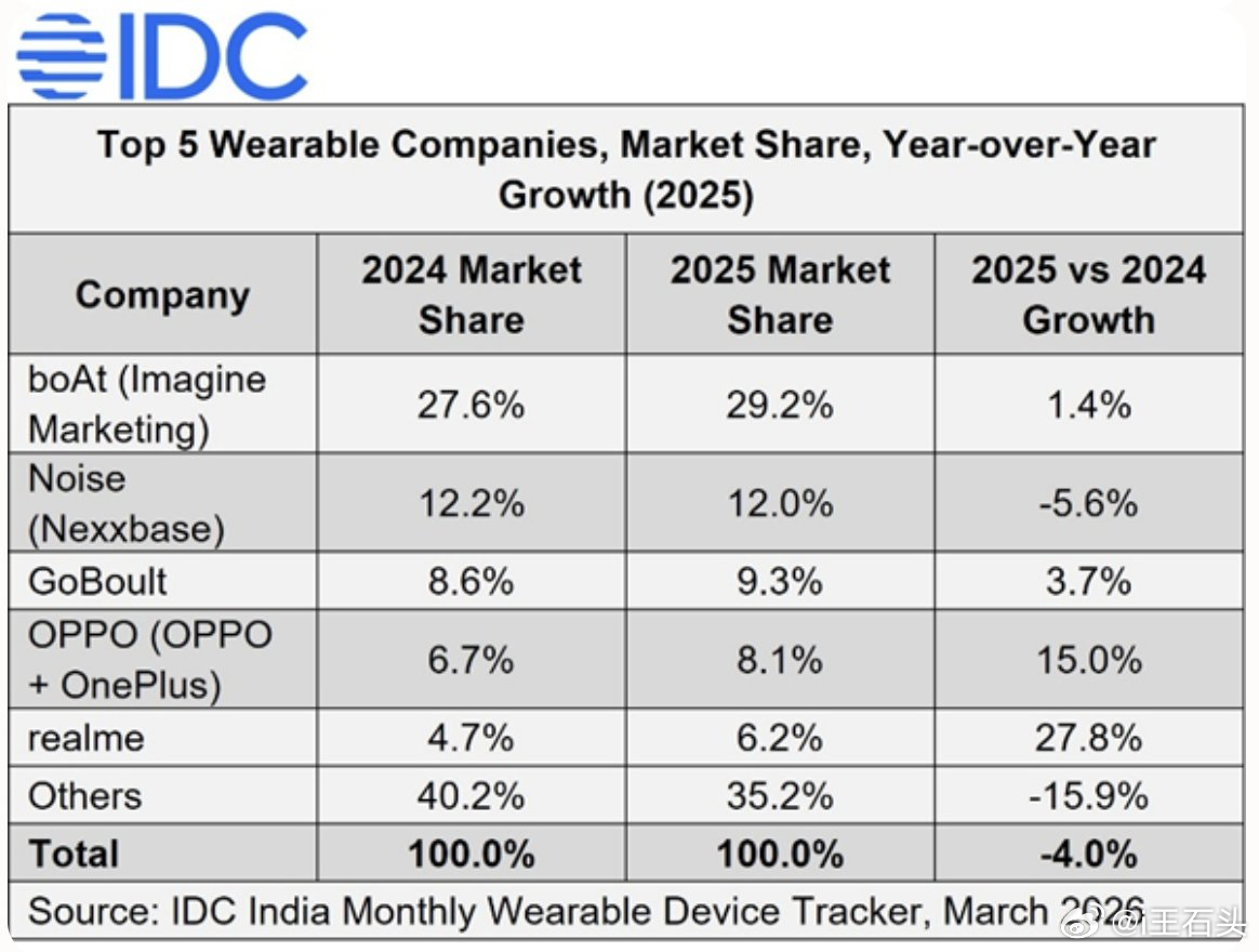 真我应该只是在国内市场缩窄,毕竟国内竞争太激烈,而且产品和一加的性价比定位也有些重合,可能会砍掉一些重合业务。但真我在海外市场其实还可以,因为本来就是出口转内销的国产品牌,实际上在印度市场就还不错。IDC最新发布的印度市场可穿戴设备数据显示真我同比增长27.8%,TWS 同比增长 26.3%,即便是在市场下跌 4%的情况下,真我依然强劲增长。真我 暂停新机研发