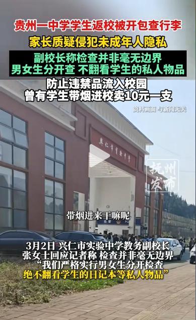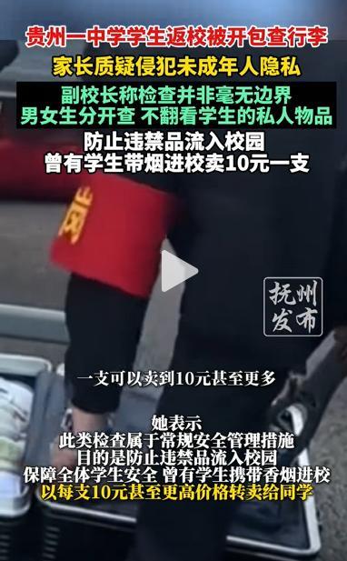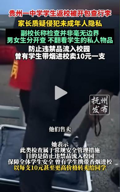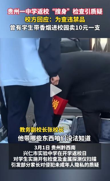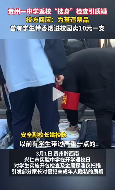 到底该不该这么做? 贵州某高校在开学的当天,对所有进入学校的学生进行搜身检查,并且还用上了金属探测仪,没有错就是金属探测仪,对于此事,很多家长也是认为这事情不妥。 孩子是来上学的,弄的比进高铁安检还严格。 行李箱书包,不管是男生女生都全部打开接受检查,家长也是偷偷拍视频发到了网上。那么这所谓的安全第一,到底是把孩子的尊严按在地上狠狠的摩擦。 面对家长的疑惑,学校也是苦不堪言,终于说出了这么做的苦衷,学校并没有不尊重学生,男女分开检查,不检查笔记和女孩的私人用品的。 还有就是学校是属于半封闭式的,学校里有孩子带烟的,一根就能够卖到10元钱,这群学生那是卖的比小卖部都黑。 甚至还有的拿着玻璃瓶或者碎玻璃威胁老师给予请假,好在是没有发生事情,一旦发生了事,学校也担不起这个责任啊,所以说安全才是第一位,顾不上别人指手画脚。 其实这种事情做的也很好,最起码的能够给孩子安全的学习环境,你就好比去迪士尼还要一个个检查呢,你们怎么不去吐槽呢?