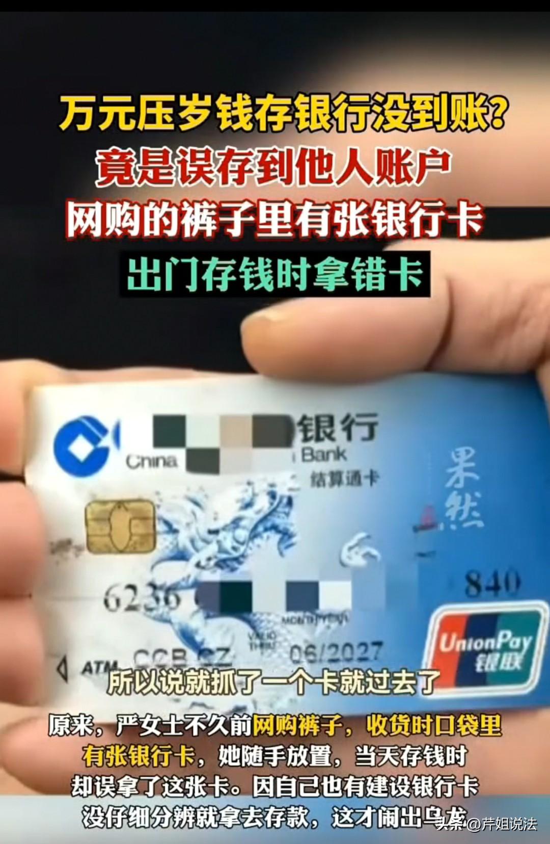 太不可思议了!武汉,女子拿着长辈给的11000元压岁钱去存,结果发现钱没有到账,后来才发现,之前网购了一条裤子,从口袋里摸出来一张银行卡,自己直接就扔在抽屉里,去存钱的时候,却误将这张卡带上了,因此,11000元钱存给了别人,最后,银行的经理陪着女子一起到派出所求助,几经周折才联系上了当初退货的李女士,她确实是在退货的时候,误将银行卡揣到了口袋,直接退货了。 素材来源于:齐鲁壹点 严女士在过年的时候收到了很多长辈的红包,加起来有11000元。 她平时是一个比较有规划的人,拿到这笔钱后,她并没有乱用,而是直接想存在银行规划好后再进行下一步的开销。 随后,她就趁着天气好,拿着银行卡去柜台把这笔钱存上。 可是当自己亲自确认后,柜员也收了这笔款后,自己却没有短信来。 她最开始以为可能是时间差,还要等一下,但是左等右等短信还是没有来。 这时她发现不对,肯定中间有问题,因此立即拿出银行卡来仔细瞧。 她印象当中的卡号好像不是这样的,因此又找到了柜台员工,让他查一查,卡到底是谁的? 这时才发现,卡是一个姓李的女士,严女士马上说,这不是自己的,姓都不一样。 这时柜员也纳闷了,这不是你拿来的卡吗? 后来,严女士突然想到当初自己网购了一条裤子,拿回来试穿的时候,口袋里就摸出了一张银行卡。 这张卡是建行的,而自己也有这个银行的卡,所以自己当天拿去存的卡不是自己的,是别人的。 当时她也怀疑是这条裤子,别人买回去不合适,退给店家,店家又卖给了自己,这个卡绝对是之前退货的女士的。 不过她觉得多一事不如少一事,别人丢了卡,自己补办就是,自己也不愿意再去联系店家,再去退还给卡的主人。 因此才导致自己放在抽屉里,误拿了别人的卡来存。 她把事情讲清楚了后,银行非常重视,由经理带着严女士一直到了派出所把事情说明,希望得到帮助。 后来,民警赶紧进行查询,经过几天周转,终于找到了真正的主人李女士。 李女士是河北任丘的,她说自己的卡确实丢了,当初也确实买过一条裤子,在四川的时候不小心就把卡放进了裤兜里,最后不合适退的时候就忘记拿出来了。 事情终于真相大白,李女士也说自己已经收到了信息,确实卡里多了一笔钱,也愿意配合归还。 就这样,双方加了联系方式,对方也将11000元转给了严女士,事情才终于得到解决。 那么这个事情确实有点蹊跷,首先是严女士收到了,不是自己的卡,却未告知店家将其寻找主人,这也给自己埋下了隐患。 第二个是柜员,没有查看签字人和卡号的主人,不是一个姓,这是不是工作疏忽呢?是不是应该多问一句呢? 另外,店家在退换货的时候就不能摸摸口袋吗?现在出现这样的事情也挺多的,但出现这样的乌龙还是第一次。 希望以后大家都能够对自己负责一点,不要因为自己不仔细,就因小失大。 《民法典》第九百八十五条:得利人没有法律根据取得不当利益的,受损失的人可以请求得利人返还取得的利益。 《民法典》第一百二十二条:因他人没有法律根据,取得不当利益,受损失的人有权请求其返还不当利益。 这件事虽然是一场无心的乌龙,但从法律角度来说,属于典型的不当得利。 严女士误将11000元存入他人账户,李女士在没有任何合法依据的情况下收到这笔钱,就构成了不当得利,按照法律规定必须及时返还。 好在双方都通情达理,事情顺利解决。如果对方拒不归还,严女士完全可以通过法律途径追回。 同时,银行柜员办理业务时没有认真核对身份信息,也存在一定的操作疏忽。 生活中涉及钱财的事一定要细心核对,避免因为粗心大意给自己带来不必要的麻烦和损失。 对于此事,大家如何看?