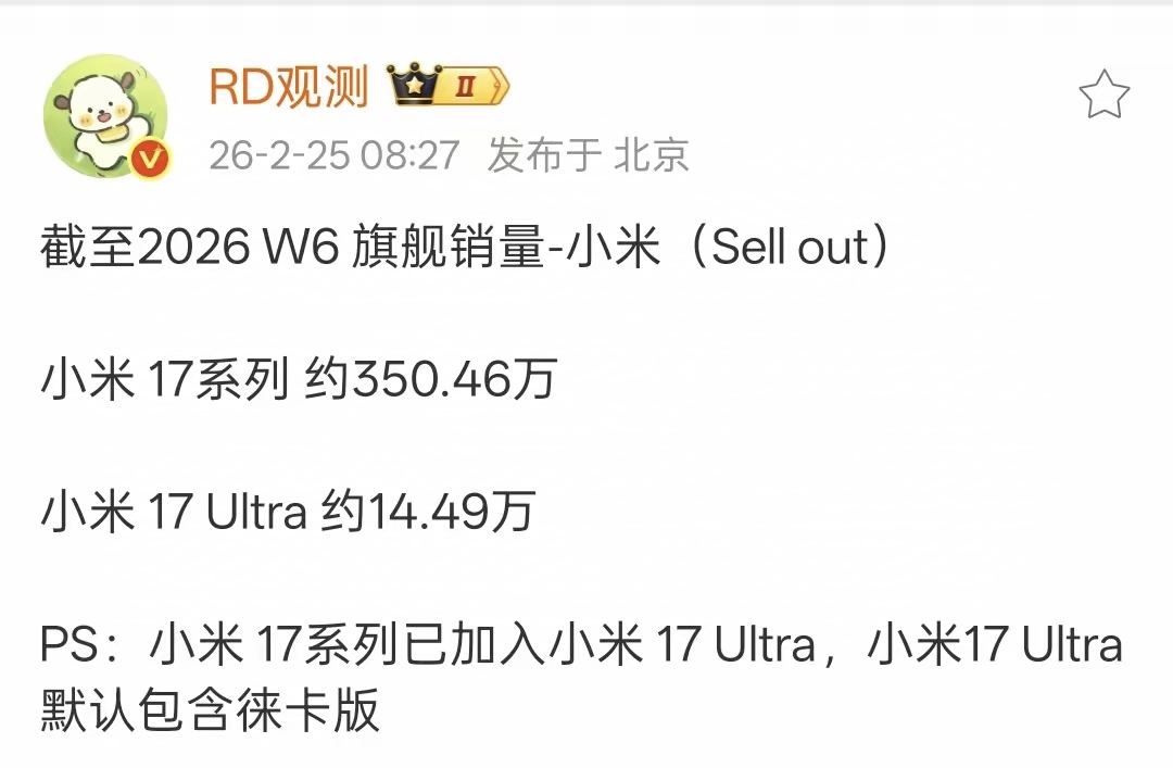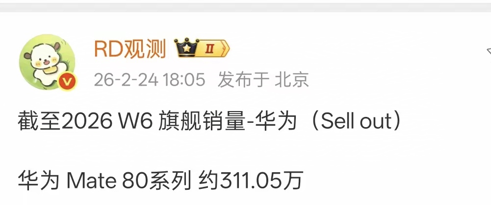 Mate80系列销量增速确实快,开售时间比xiaom17系列晚了整整两个月,如今总销量正式突破311万台,和xiaomi的差距只有50多万台,但要知道Mate80系列至今还没有全面现货,而且均价比xiaomi 17系列更高一些,按照这种情况,再用半个月左右,Mate80系列就能拿下国产高端机销冠。