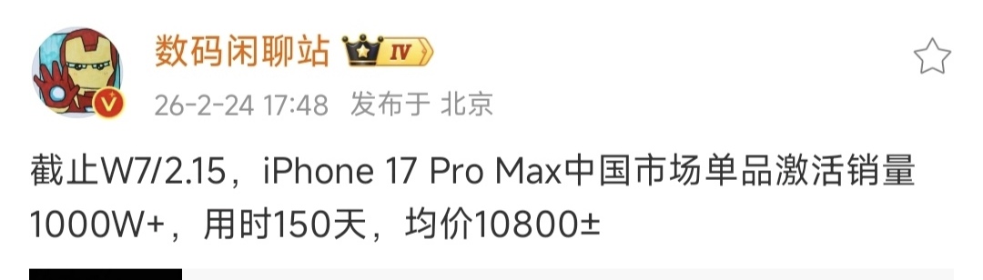 当然真正的王炸还是iPhone 17系列,博主数码闲聊站最新透露的消息,均价超过一万元的iPhone 17 Pro Max,用时150天,在我国市场激活量已经突破1000万台,而整个iPhone 17系列,早在2月6日,在我国激活量突破2000万台。